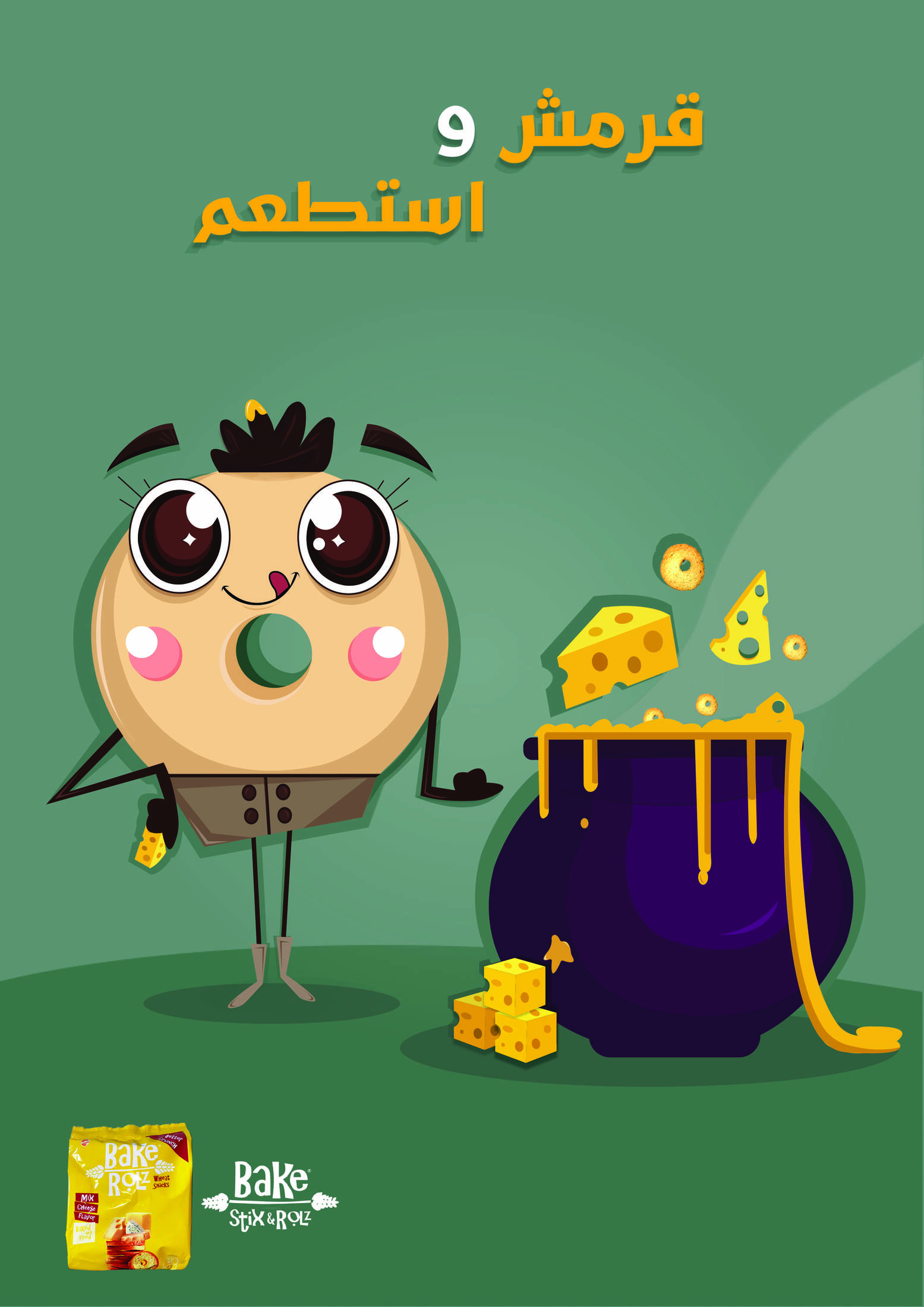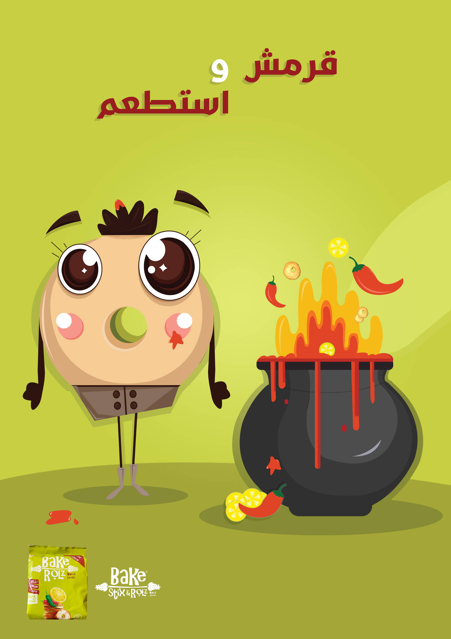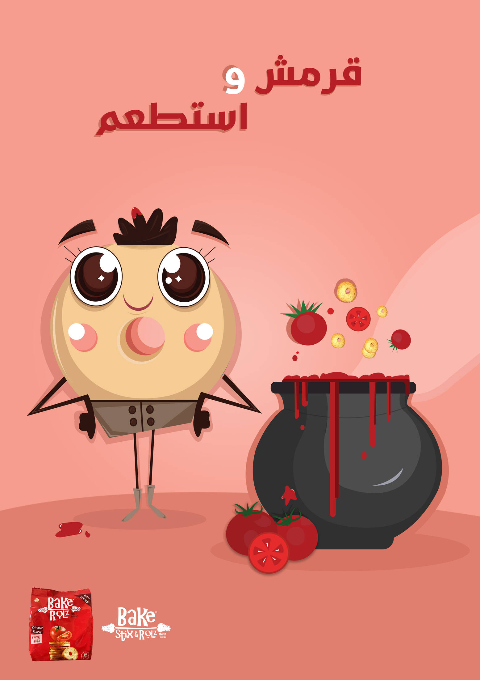 I designed posters for the Bake Rolls product, and the design of these posters relied on drawing everything in the poster, starting with drawing the character and backgrounds, in order to design a new poster for the Bake Rolls product