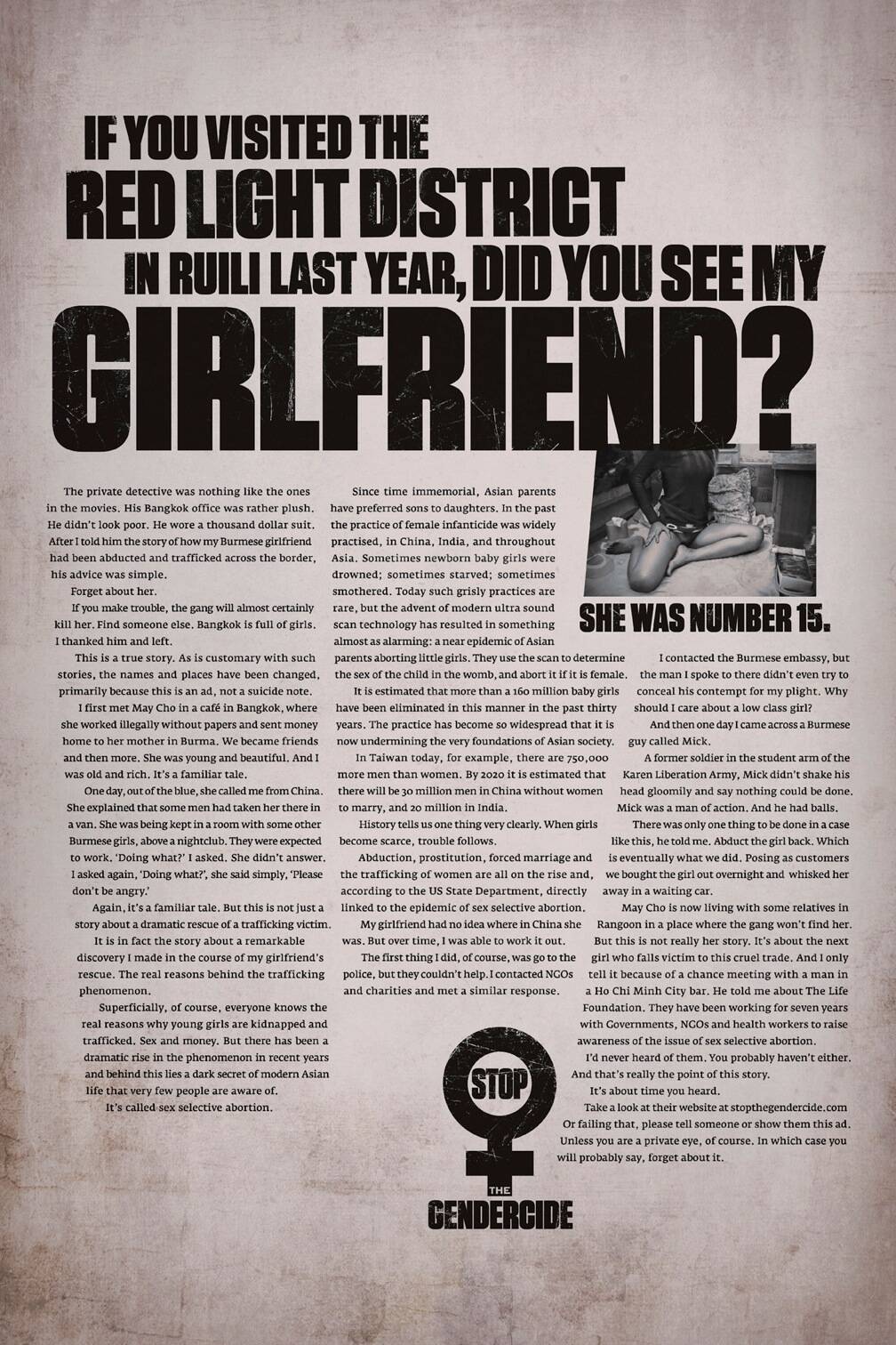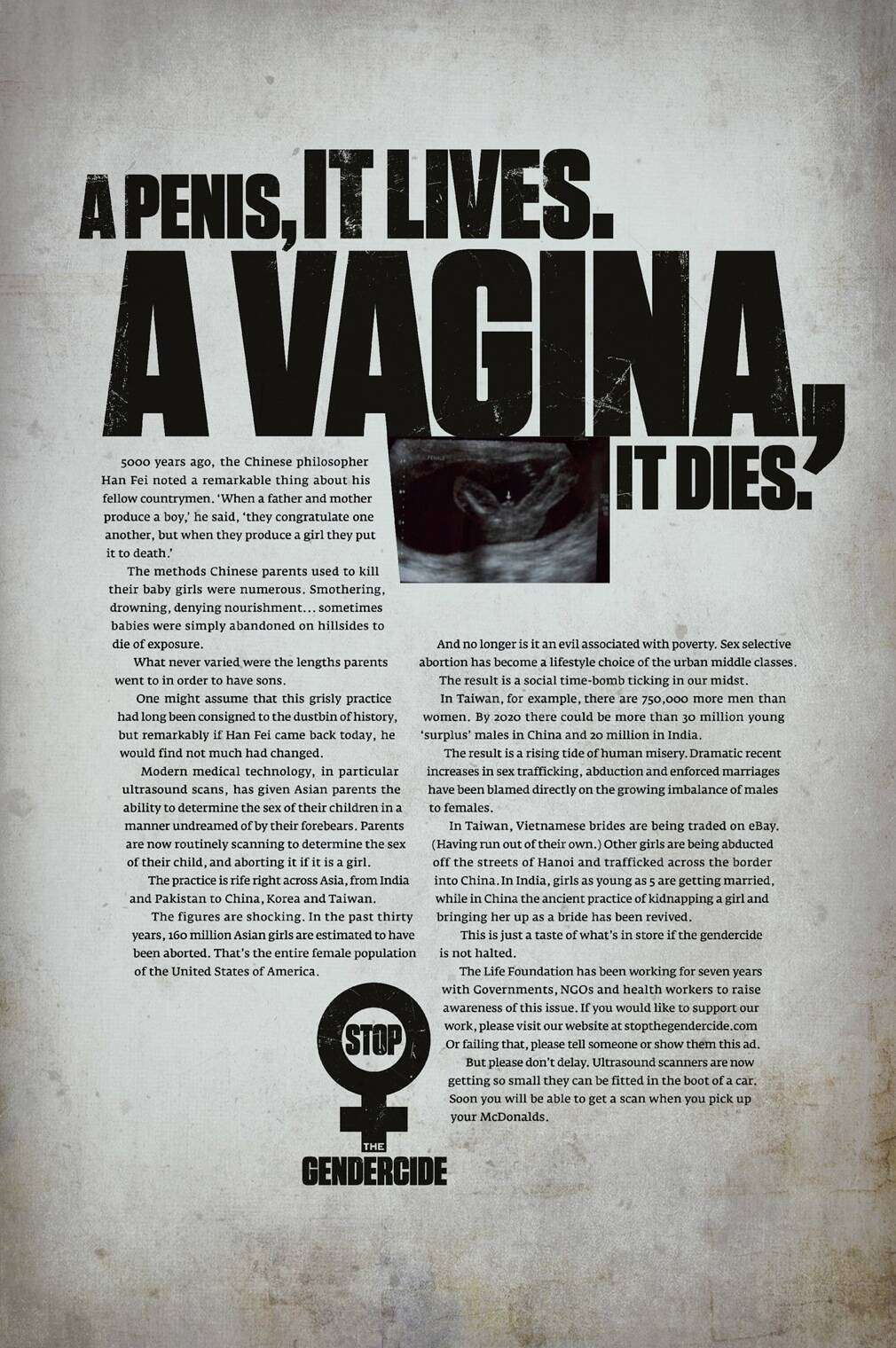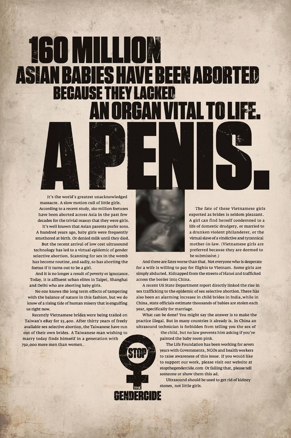 This professional campaign titled '160 million, Girlfriend, A penis, it lives, Kill her' was published in Vietnam in February, 2013. It was created for the brand: The Life Foundation, by ad agency: Ogilvy. This Print medium campaign is related to the Public Interest industry and contains 4 media assets. It was submitted over 12 years ago.