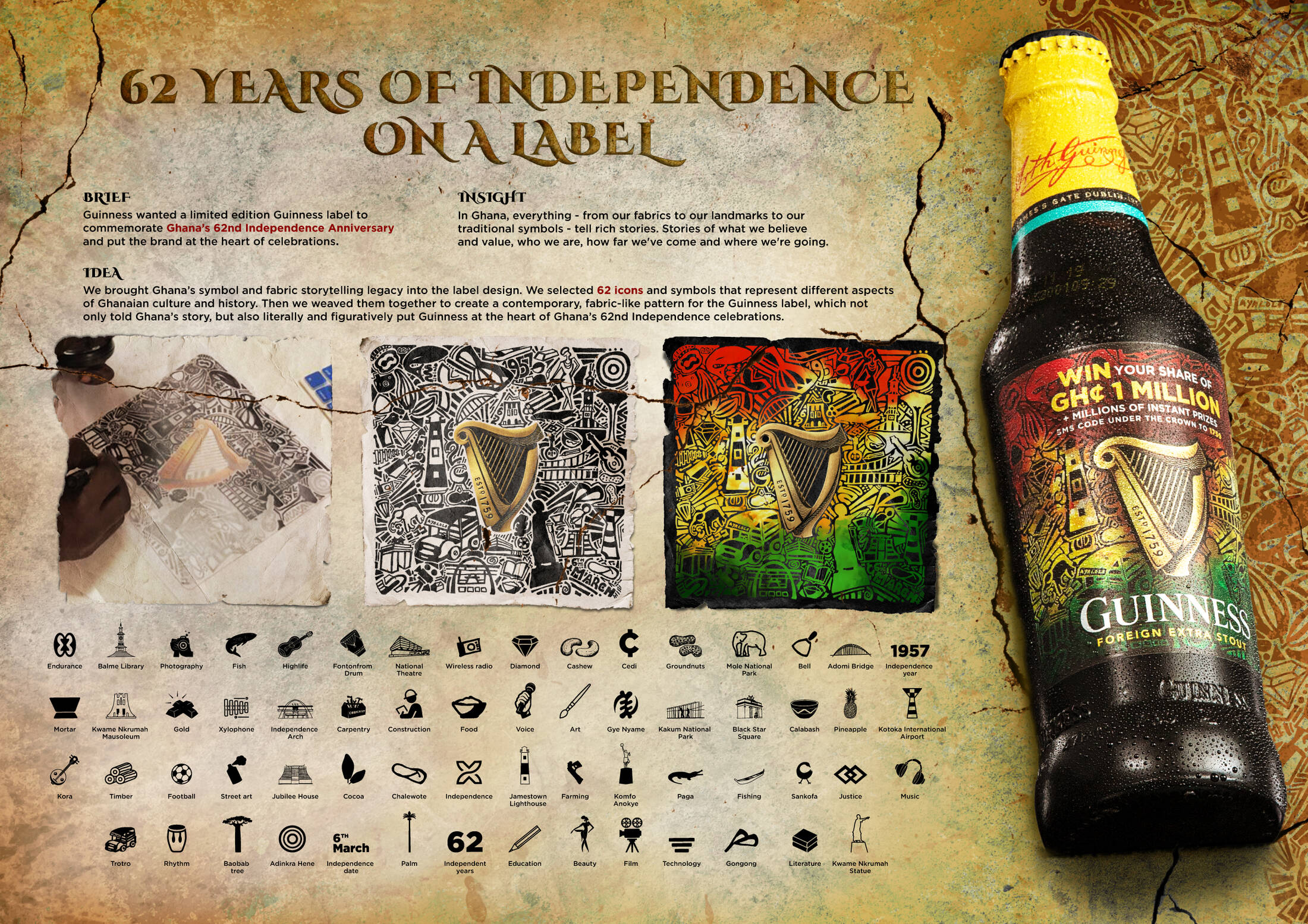 We brought Ghana’s symbol and fabric storytelling legacy into label design. We selected 62 icons and symbols that represent different aspects of Ghanaian culture and history. Then we weaved them together to create a contemporary, fabric-like pattern for the Guinness label, which not only told Ghana’s story, but also literally and figuratively put Guinness at the heart of Ghana’s 62nd Independence celebrations.