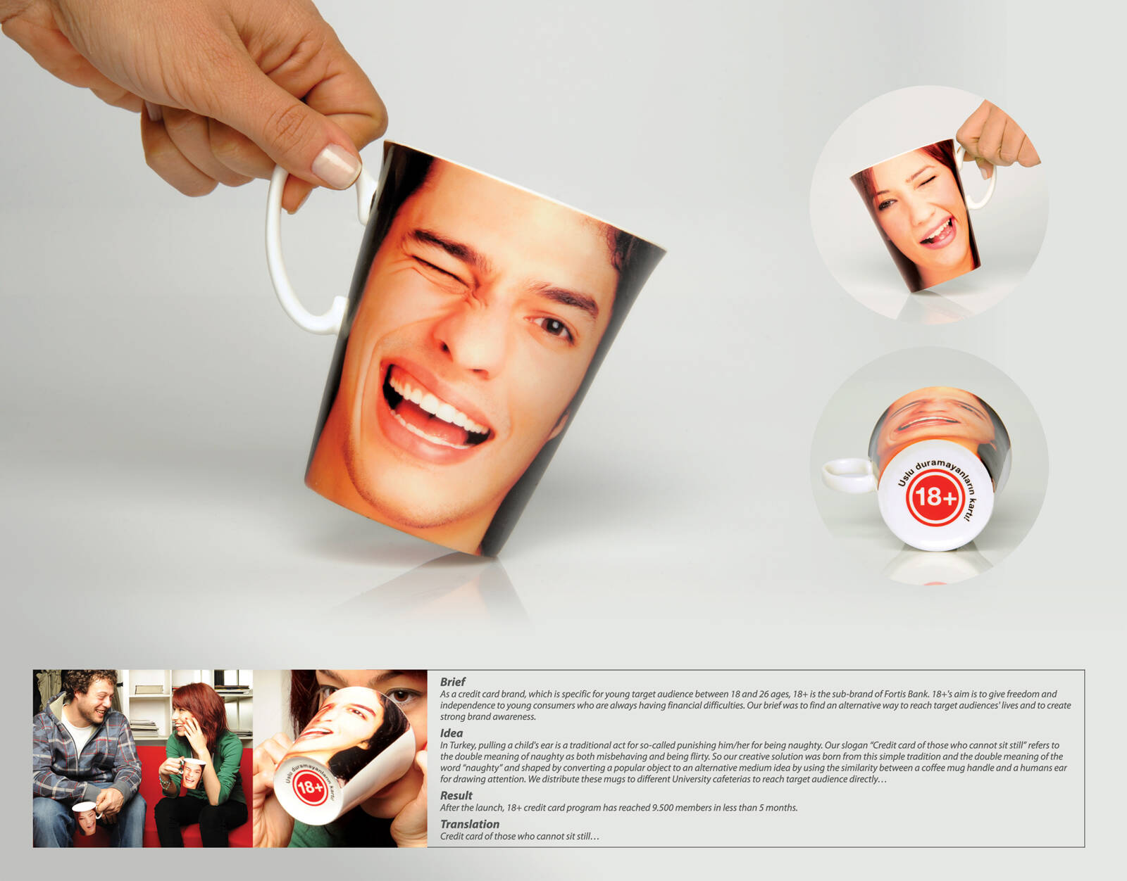 This professional campaign titled '18+ mug' was published in Turkey in December, 2008. It was created for the brand: Fortis, by ad agency: Gram. This Static Images medium campaign is related to the Finance industry and contains 1 media asset. It was submitted over 16 years ago.