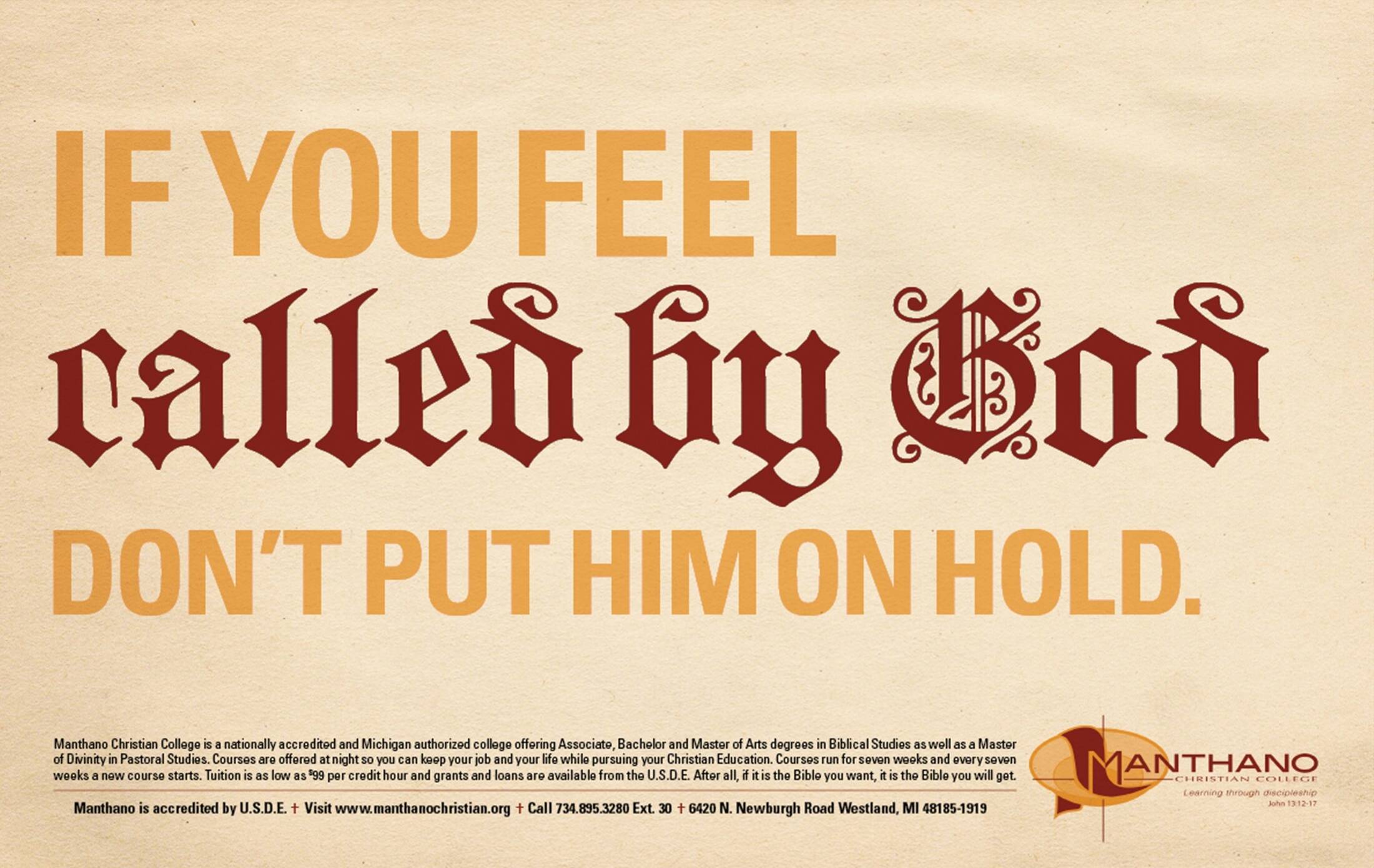 A small college devoted to teach the inerrant word of God, Manthano Christian College tasked McCann Detroit to create recruitment posters. To serve in the pastoral and ministerial fields is no small step. Those who make the commitment must be somewhat predisposed to the notion. The posters were just giving a little encouragement to a question that was already seeded in the readers mind.