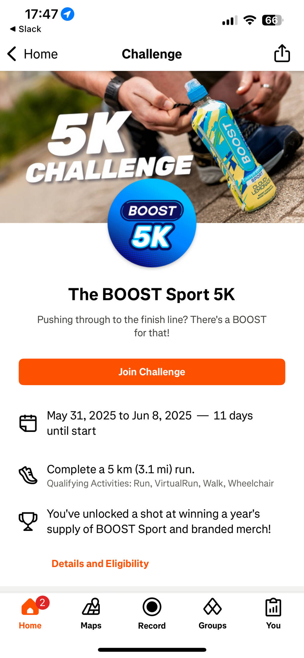 Participants who complete the challenge between 31 May and 8 June will earn a bespoke BOOST badge on the app and be entered into a prize draw to win a year’s supply of BOOST Sport and branded merchandise.