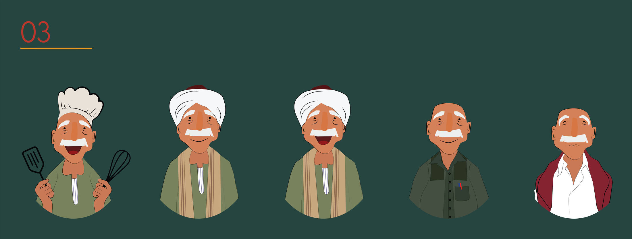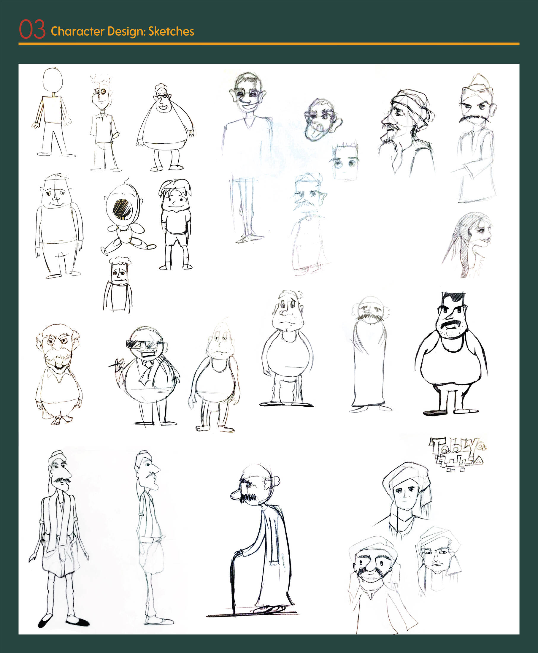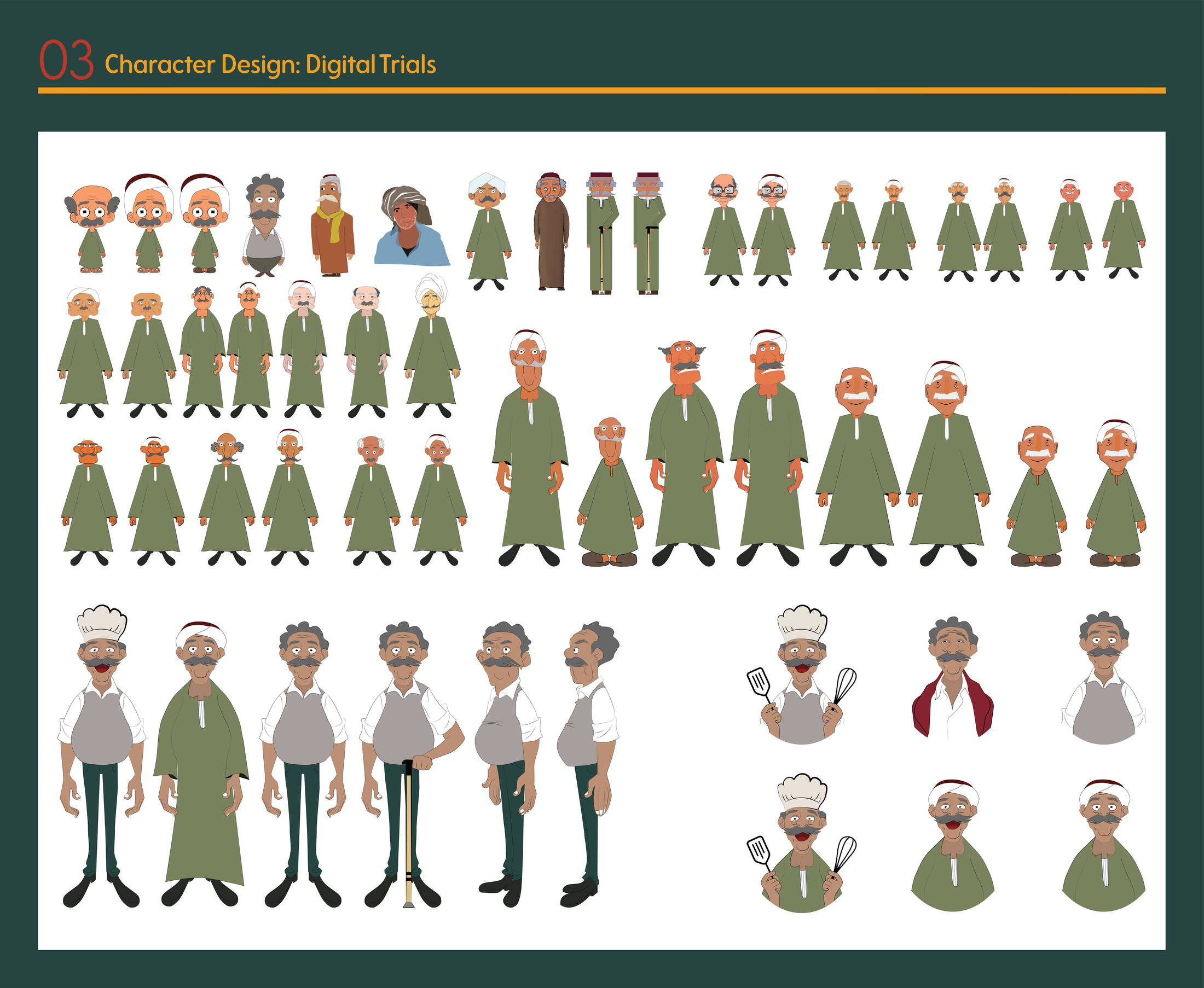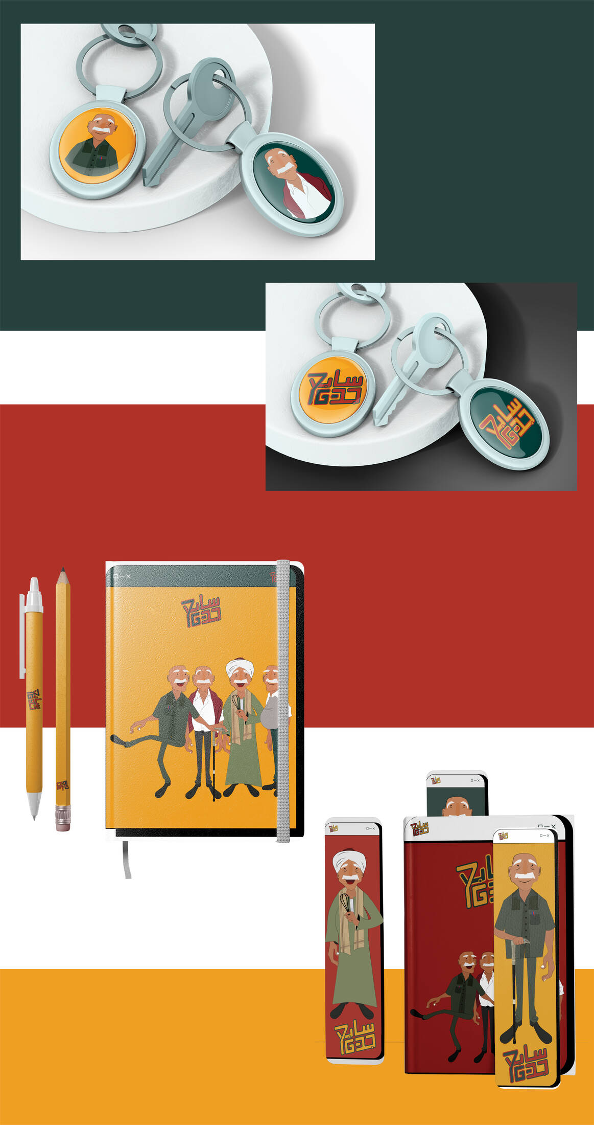 And, because Egypt has numerous and diverse cultures, I had Gedo symbolize some of them by, dressing him first in an employee's suit, which represents the majority of educated and conscious Egyptian individuals who got various certifications and paid attention to its details. I chose the old suit, which was also dressed by Ramadan Mabrouk Abu Alamein Hamouda, the renowned figure, and how they used to place colored pens in the suit's pocket, and second, the chivalrous and genuine Saidi man, to whom I also paid attention to his details, such as the color of his robe, the way he wraps his 3ema- عمة,-ِ the shawl he wears, and even the stick on which it rests, which bears the shape of an eagle, and as is known the importance of the eagle to Egyptians, even an eagle appears on the country's flag. As for the upper class, the modern Gedo donning a shirt and pants, and eventually making him resemble the renowned Bassem character from the series "The Truth and the Mirage- el7aqeqa w al Sarab- ," to communicate a little bit about youth, memes, and Egyptian comics
