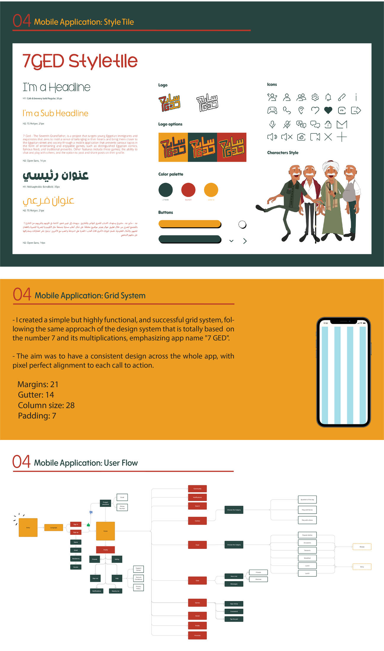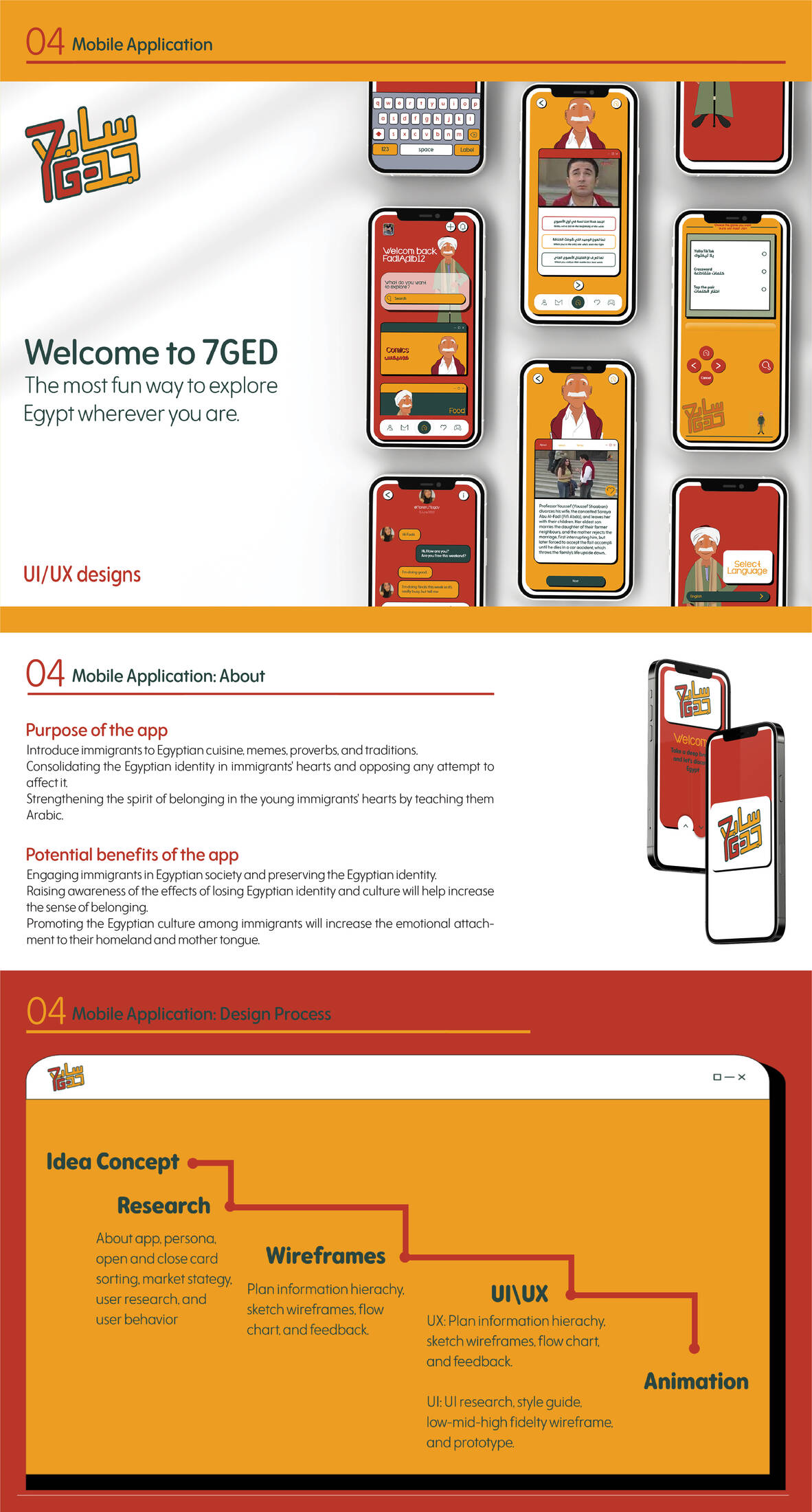 7 Ged - The Seventh Grandfather, is a project that targets young Egyptian emigrants and expatriates that aims to instill a sense of belonging in their hearts and bring them closer to the Egyptian street and society through a mobile application that presents various topics in the form of entertaining and enjoyable games, such as distinguished Egyptian comics, famous food, and traditional proverbs. Other features include three games; the ability to chat and play with others; and the option to post and share posts on their profile.
