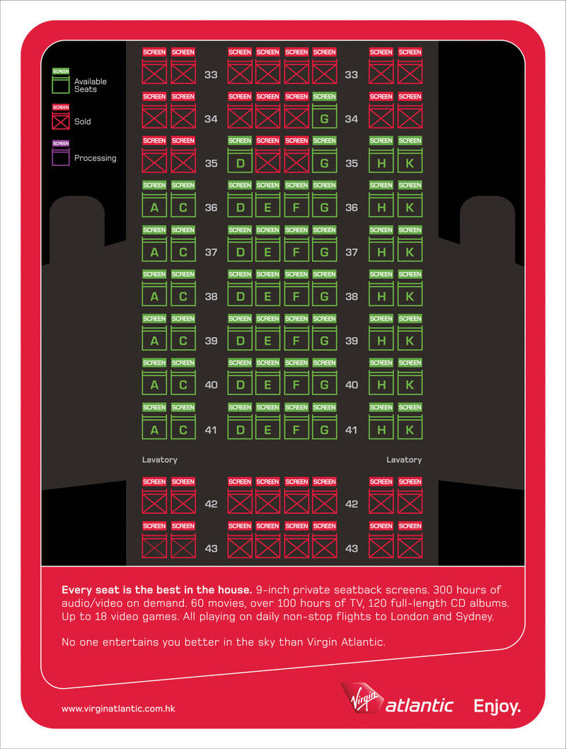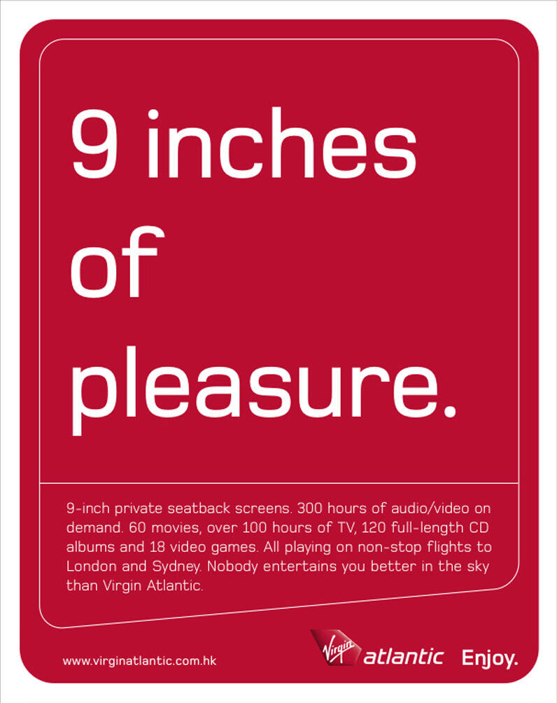 This professional campaign titled '9 inches, Play with yourself, Seating chart' was published on November 01, 2006. It was created for the brand: Virgin Atlantic, by ad agency: Eight Partnership. This Print medium campaign is related to the Transport industry and contains 3 media assets. It was submitted about 19 years ago.