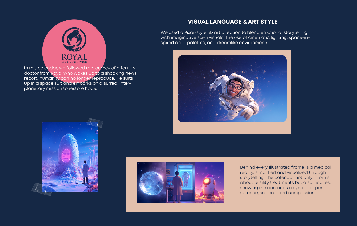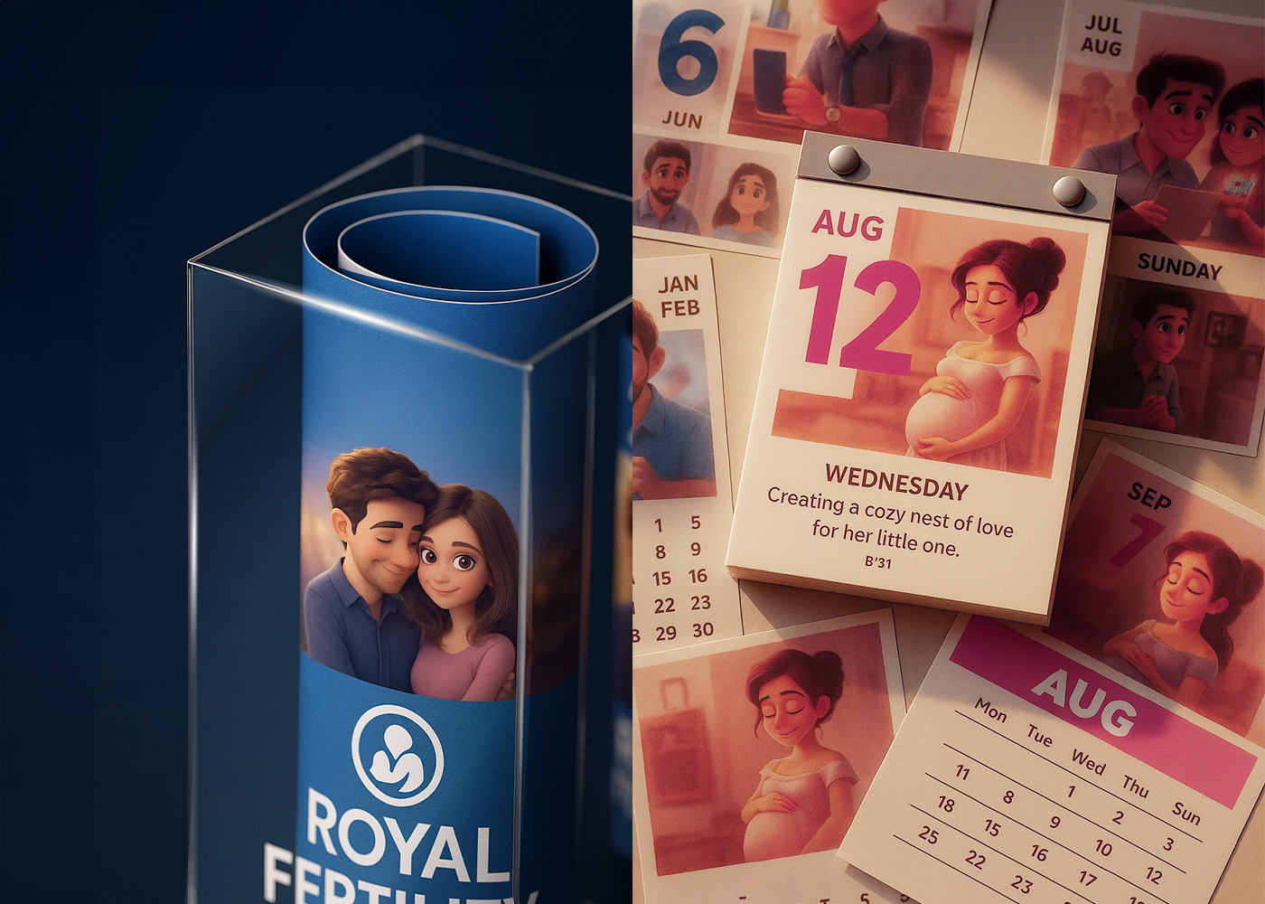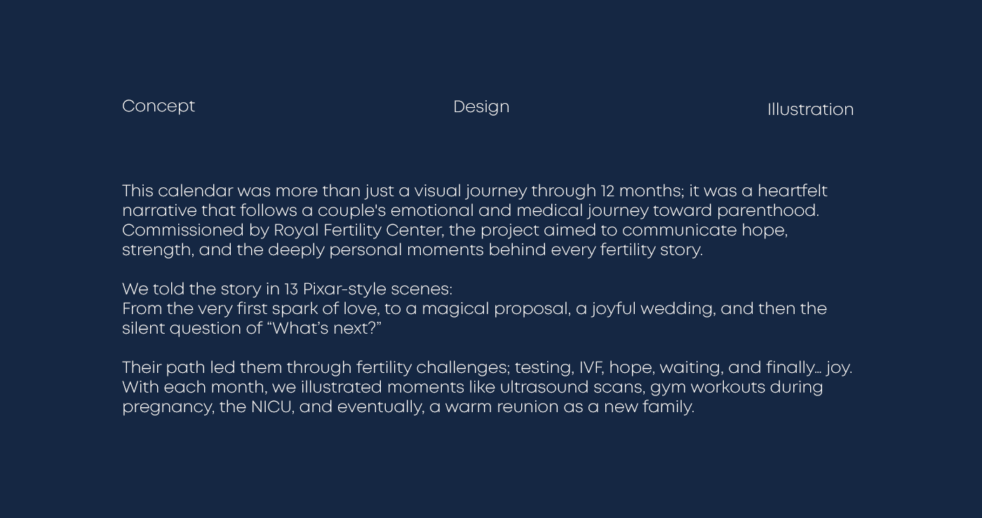 The calendar repositions Royal Fertility Center as a place where medical expertise meets emotional understanding. It breaks the coldness often associated with fertility care and replaces it with warmth, humanity, and storytelling.