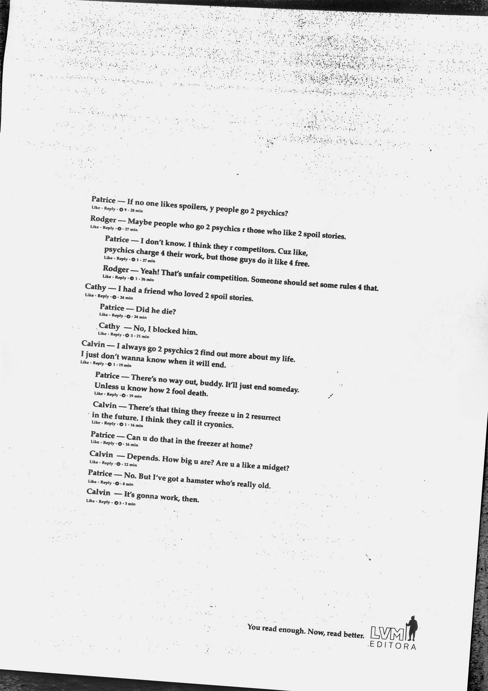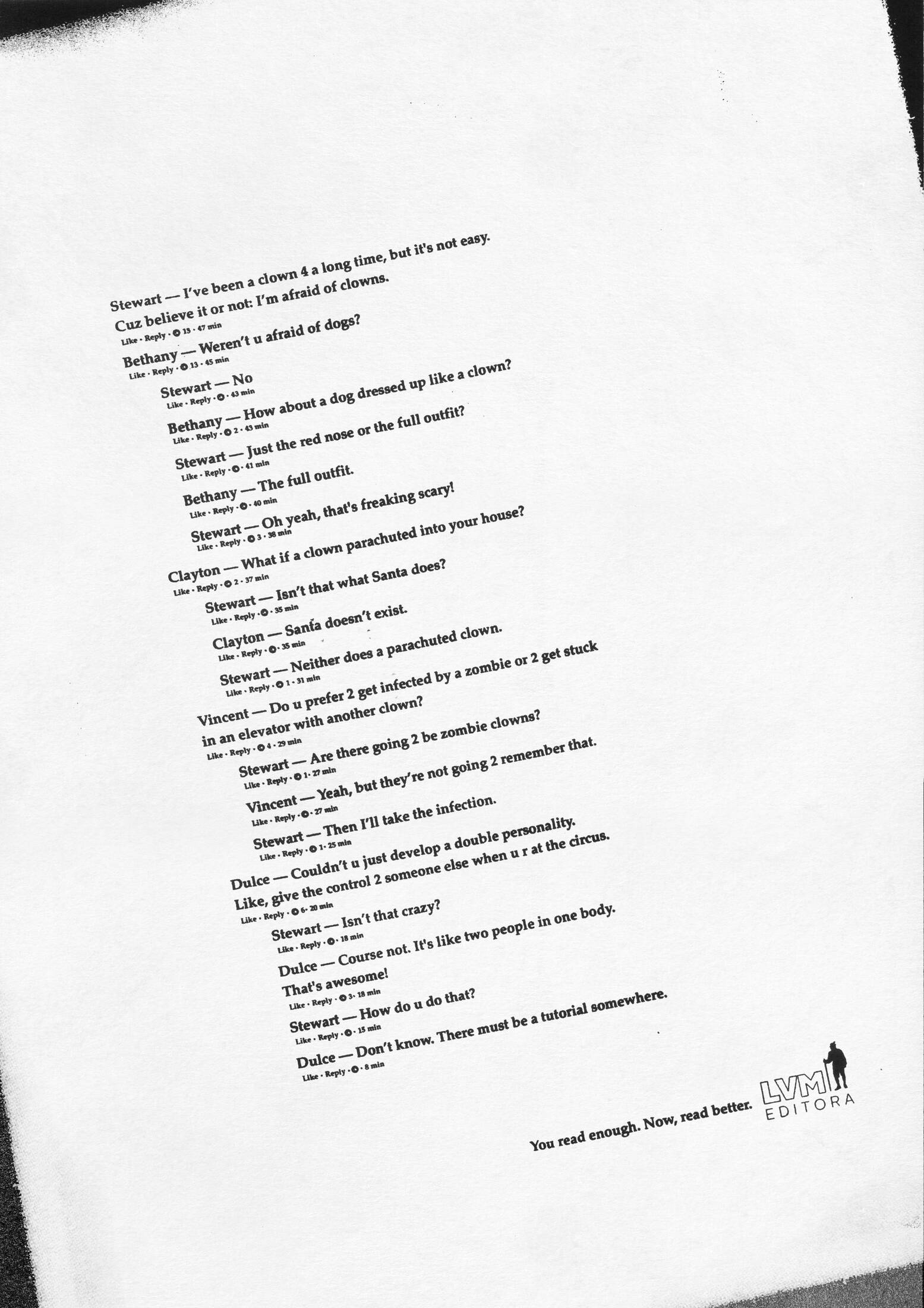 This professional campaign titled 'A Clown Who is Afraid of Clowns, The Spoiler and the Psyc...' was published in Brazil in March, 2018. It was created for the brand: LVM Editora, by ad agency: Agencia3. This Print medium campaign is related to the Recreation, Leisure industry and contains 3 media assets. It was submitted over 7 years ago.