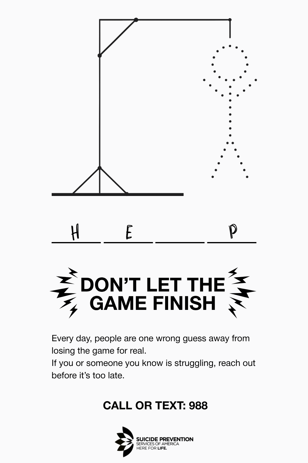 An ad campaign that turns the classic Hangman game into a metaphor for the silent battles people face during a mental health crisis. The incomplete word and unfinished figure illustrate how close many individuals feel to losing hope, often without anyone noticing their cry for help. The campaign reminds us that one message, one call, or a single conversation can save a life.