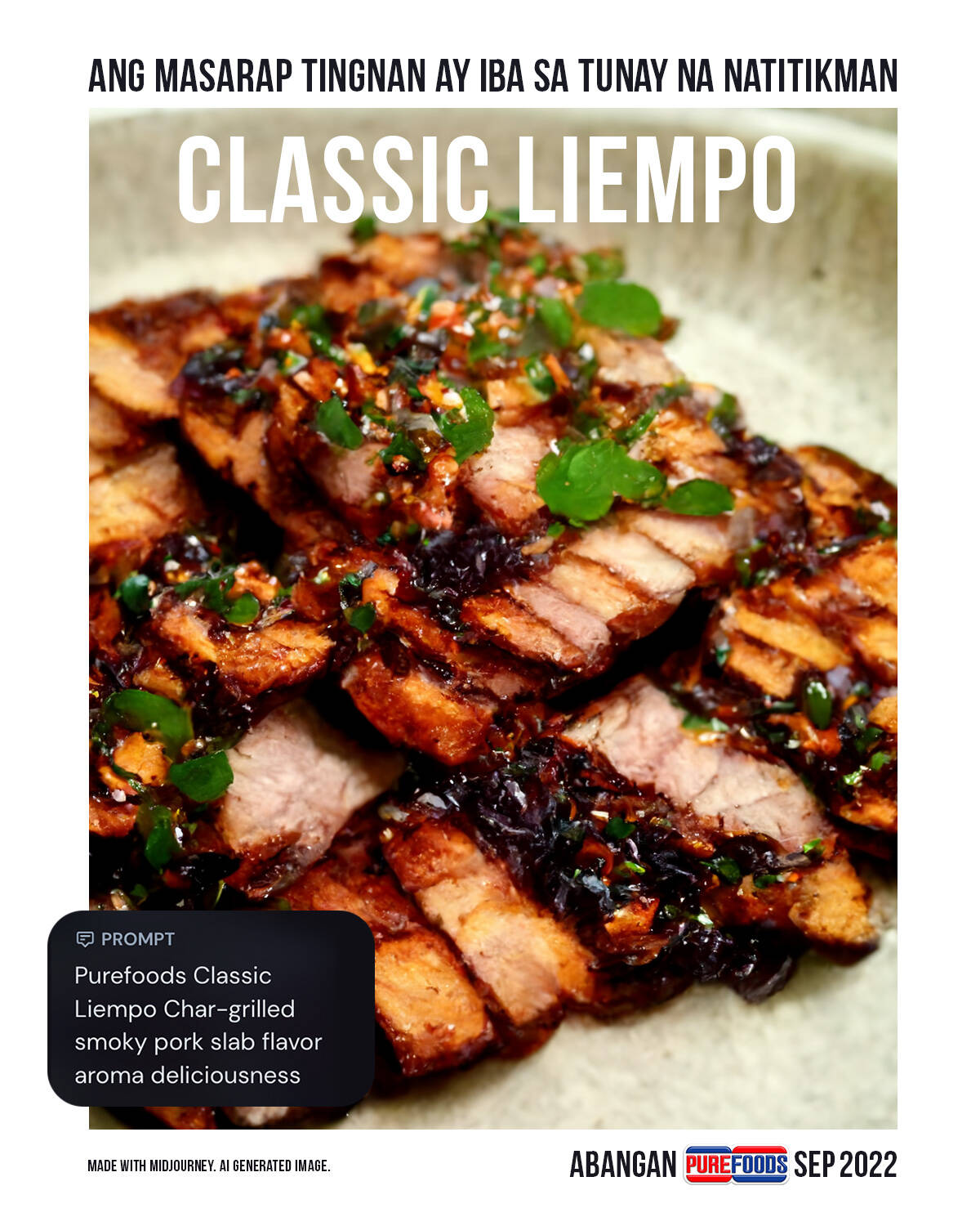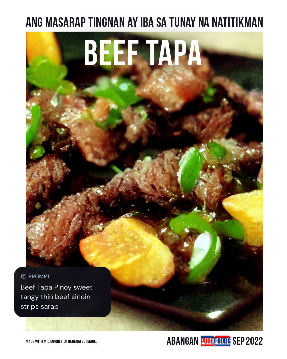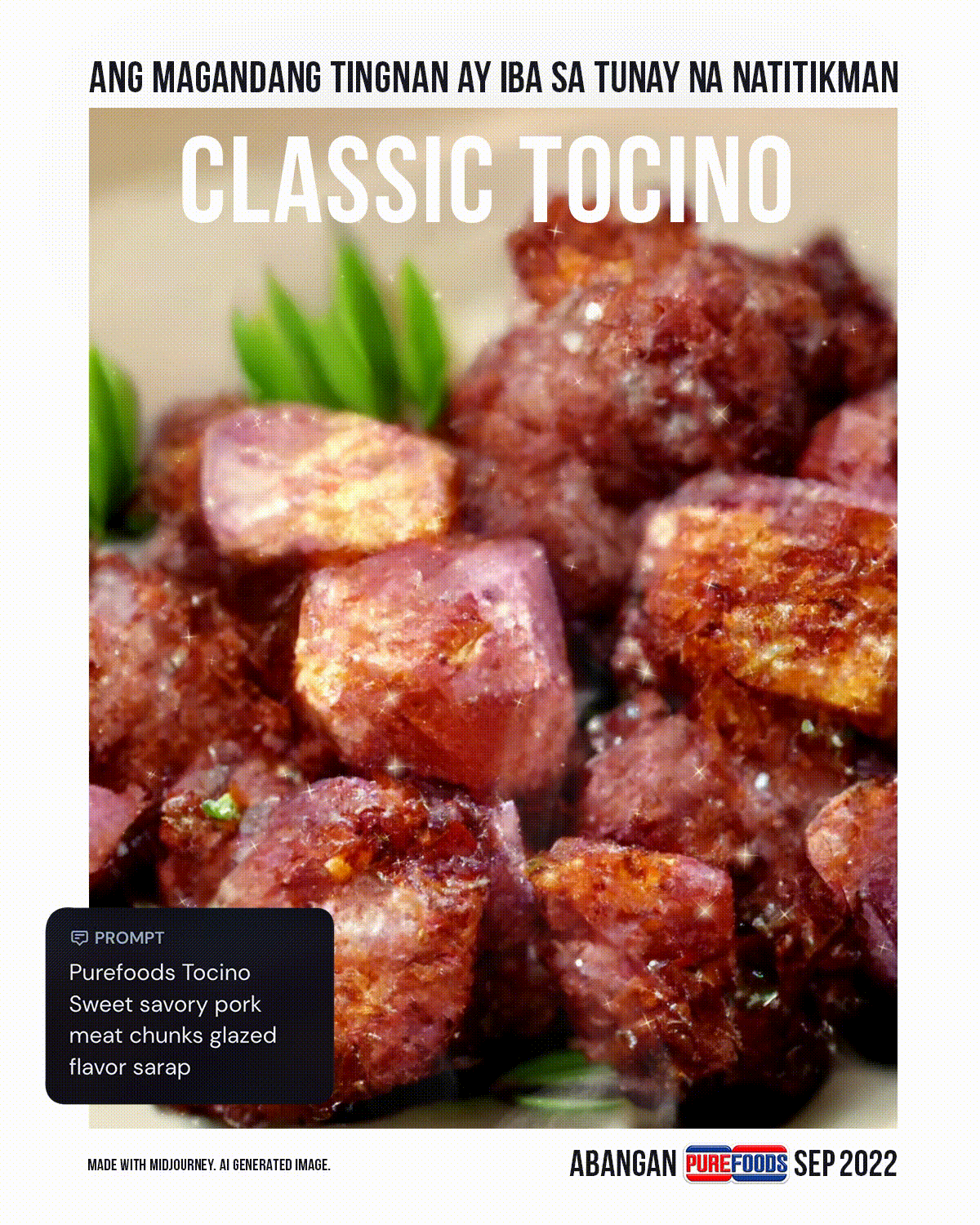 The first half of a six-image series, this A.I. generated teaser campaign aims to rise above the sea of disinformation and fake news in the Philippine social media landscape with yet another seemingly genuine piece of content - a mouthwatering shot of original Filipino meats, plated to perfection. The images, however, come with a cautionary headline - "What looks delicious is different from how it actually tastes. Purefoods. Coming soon September 2022. "