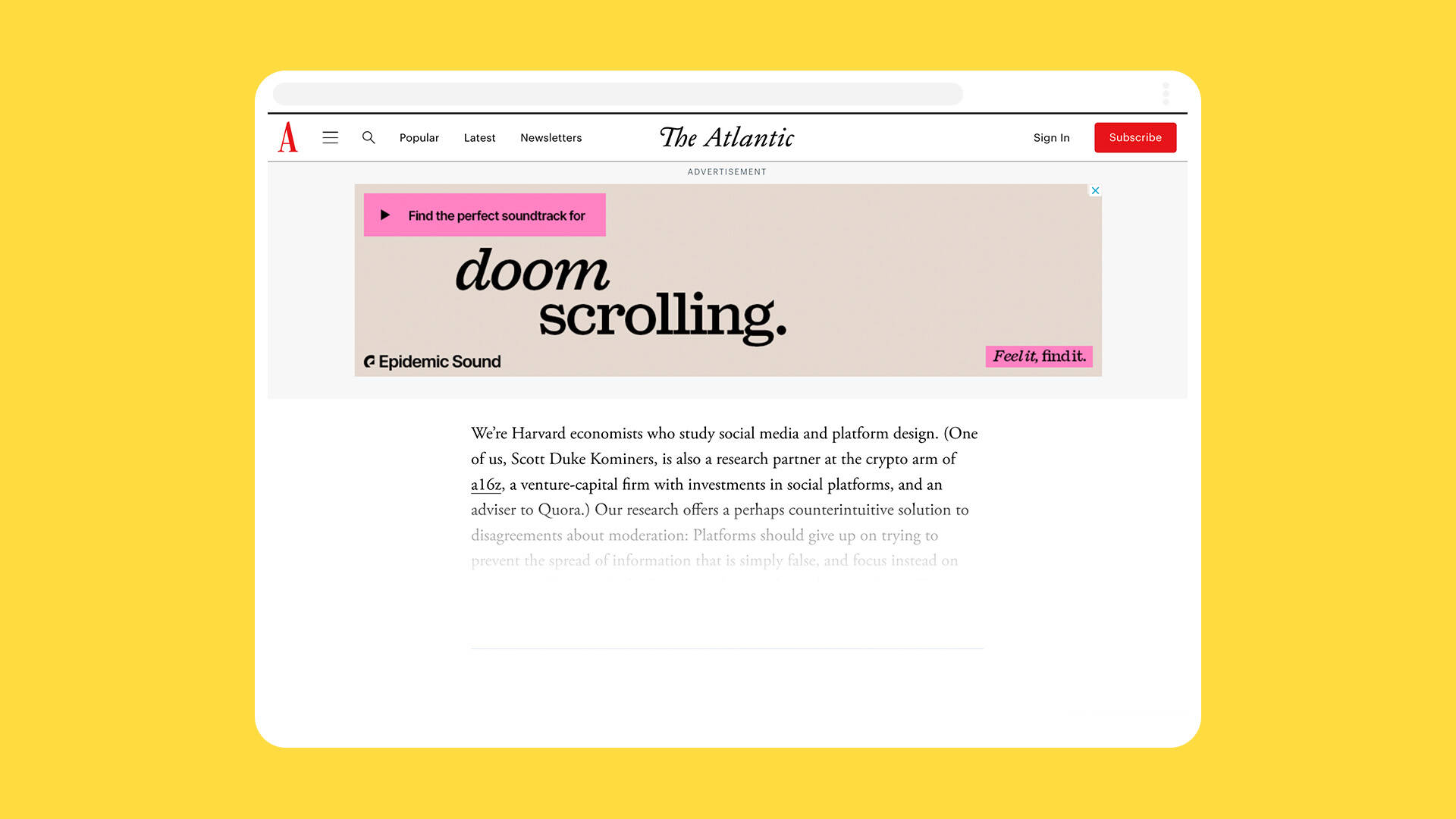 This professional campaign titled 'A Sound For Every Feeling' was published in United Kingdom and United States in April, 2024. It was created for the brand: Epidemic Sound, by ad agency: Rethink. This Audio, Digital, and OOH Outdoor media campaign is related to the Music industry and contains 9 media assets. It was submitted over 1 year ago by Communications Manager: Sara Lemmermeyer of Rethink.