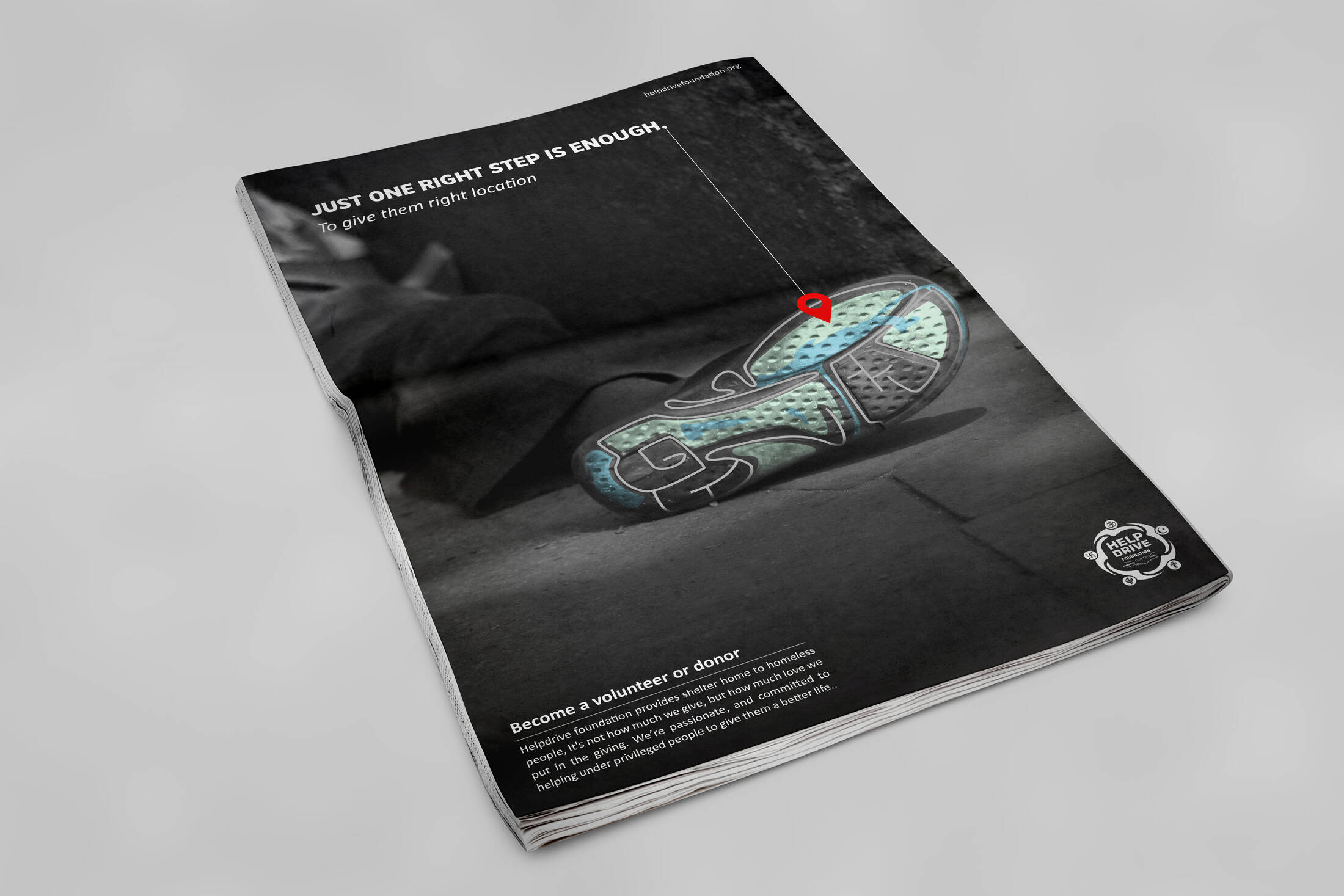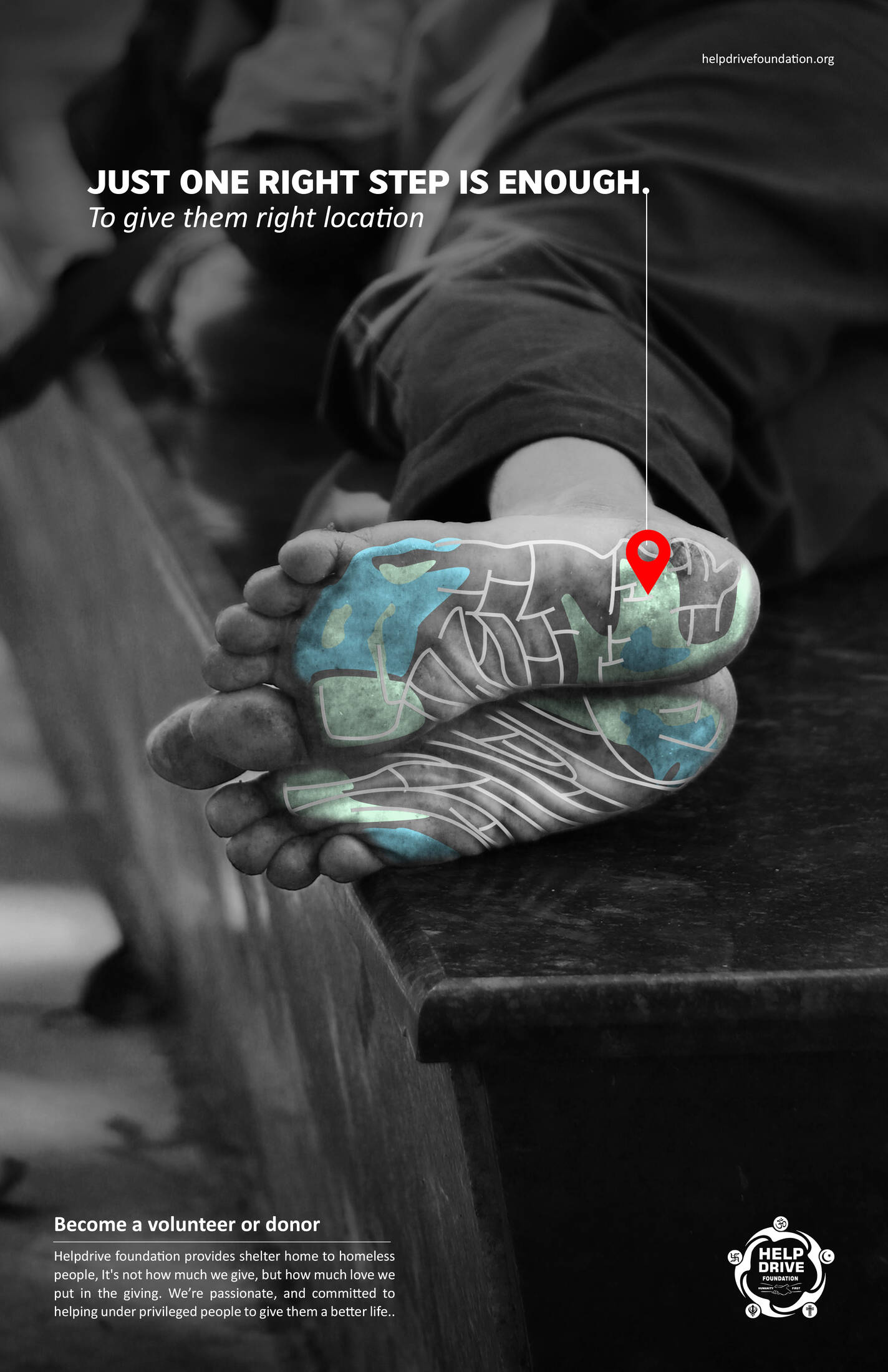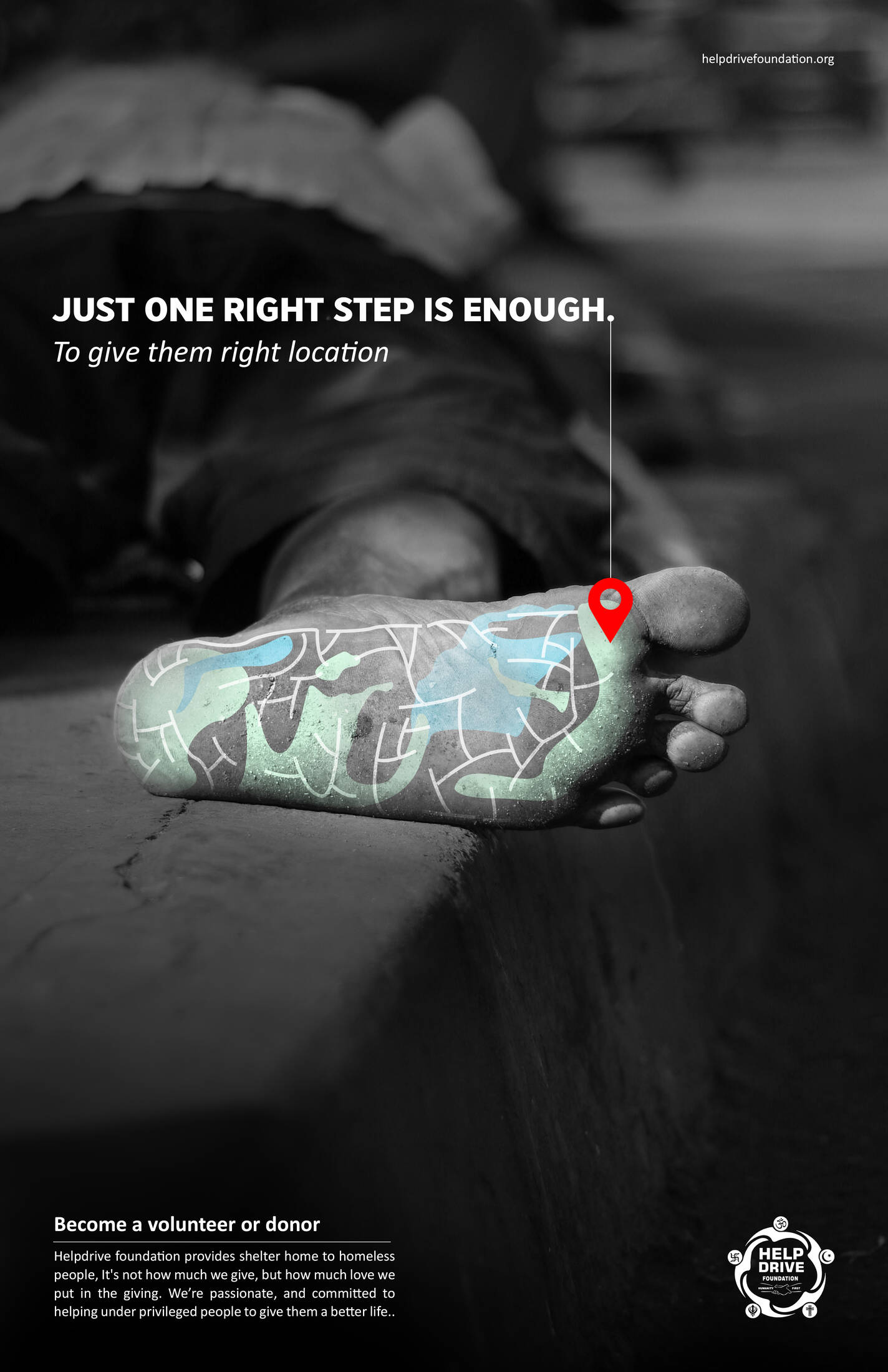 The presented print ad done for the NGO - Help Drive Foundation urges an individual to take a positive step towards the society. It is an attempt of creating awareness, to help every homeless person with a shelter as well as to provide physical and mental treatment for them. The visual representation depicts their hope of hunting for a destination. The essence of the campaign gives a fair idea to take a step towards this social responsibility by donating & becoming a volunteer.