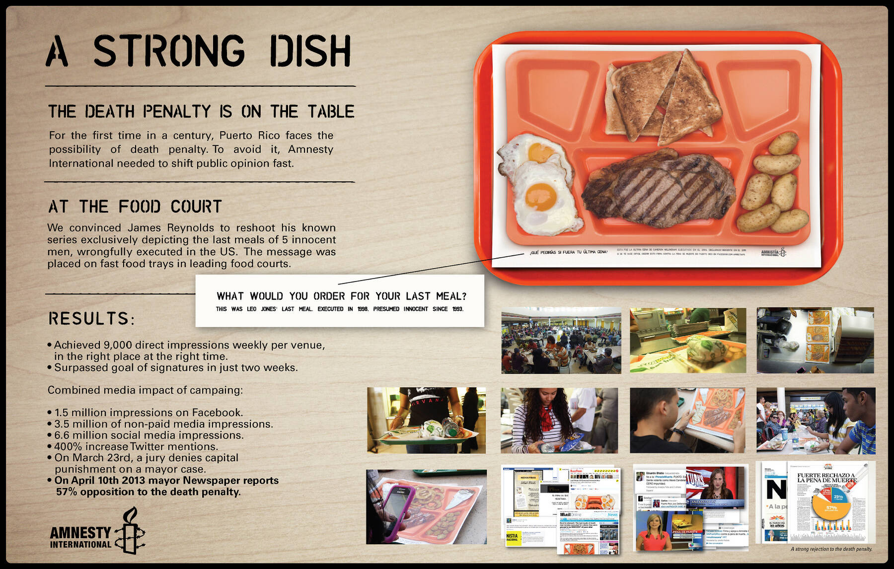 This professional campaign titled 'A strong dish' was published in Puerto Rico in June, 2013. It was created for the brand: Amnesty International, by ad agency: DDB. This Ambient medium campaign is related to the Public Interest industry and contains 1 media asset. It was submitted over 12 years ago.