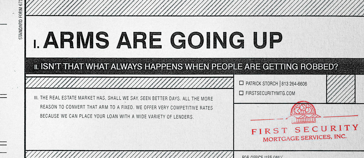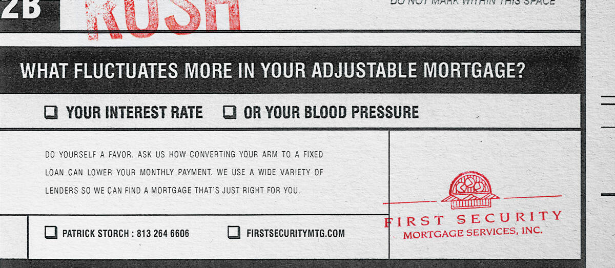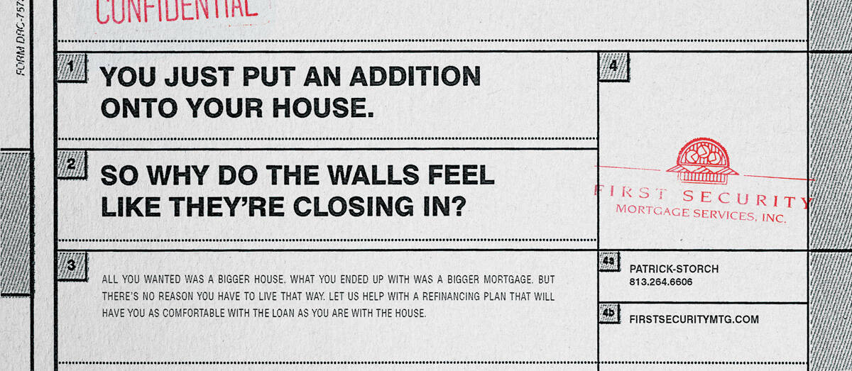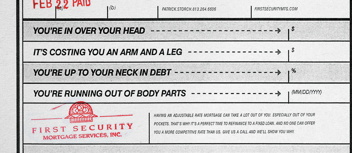 This professional campaign titled 'Addition, Fluctuates, Life, Upside down, Body parts, Arms' was published in United States in June, 2008. It was created for the brand: First Security Mortgage Services, by ad agency: 22 Squared. This Print medium campaign is related to the Finance industry and contains 6 media assets. It was submitted over 17 years ago.