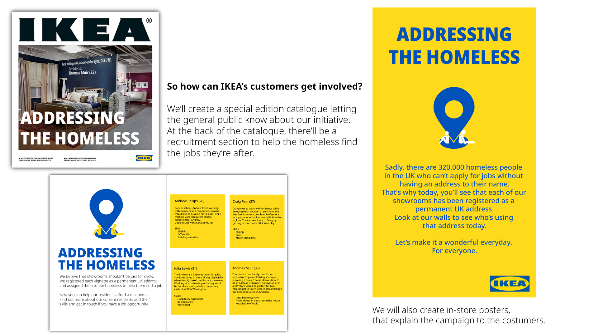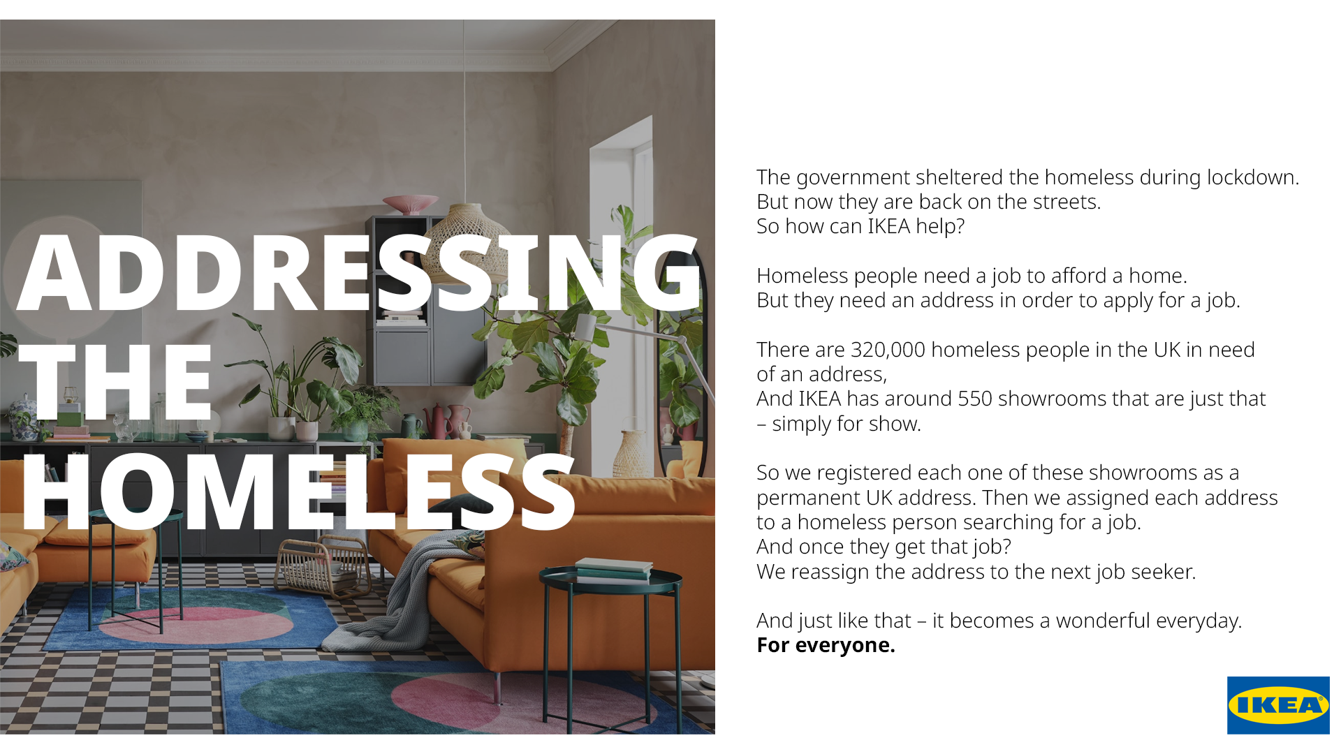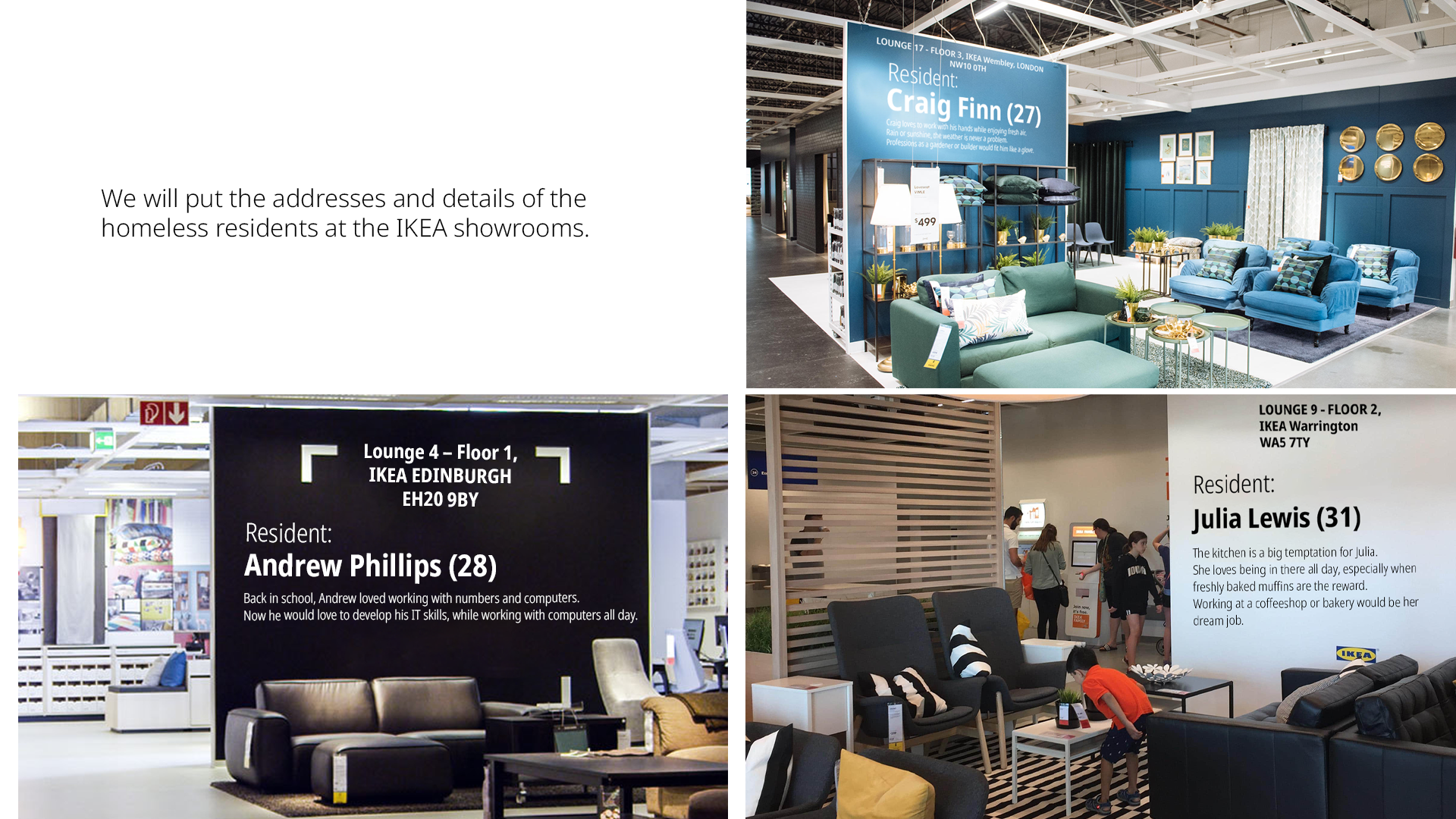 There are 320,000 homeless people in the UK in need of an address to get a job. And IKEA has around 550 showrooms that are simply just for show. So we registered each showroom as a permanent address and assigned each one to a homeless person searching for a job. And, just like that, it becomes a wonderful everyday for everyone.