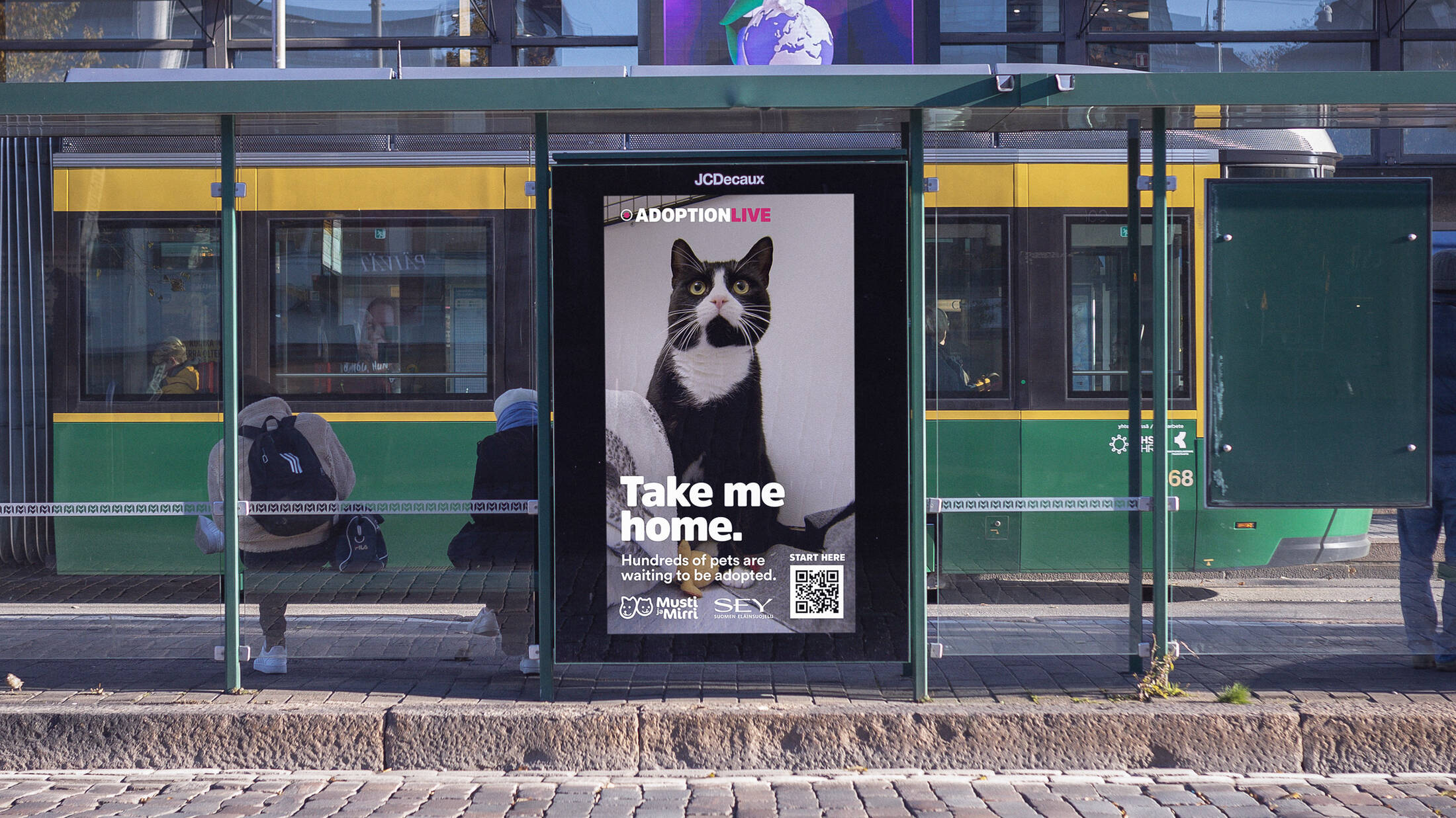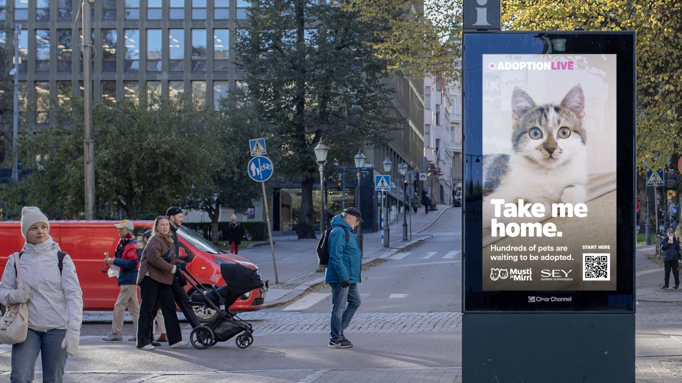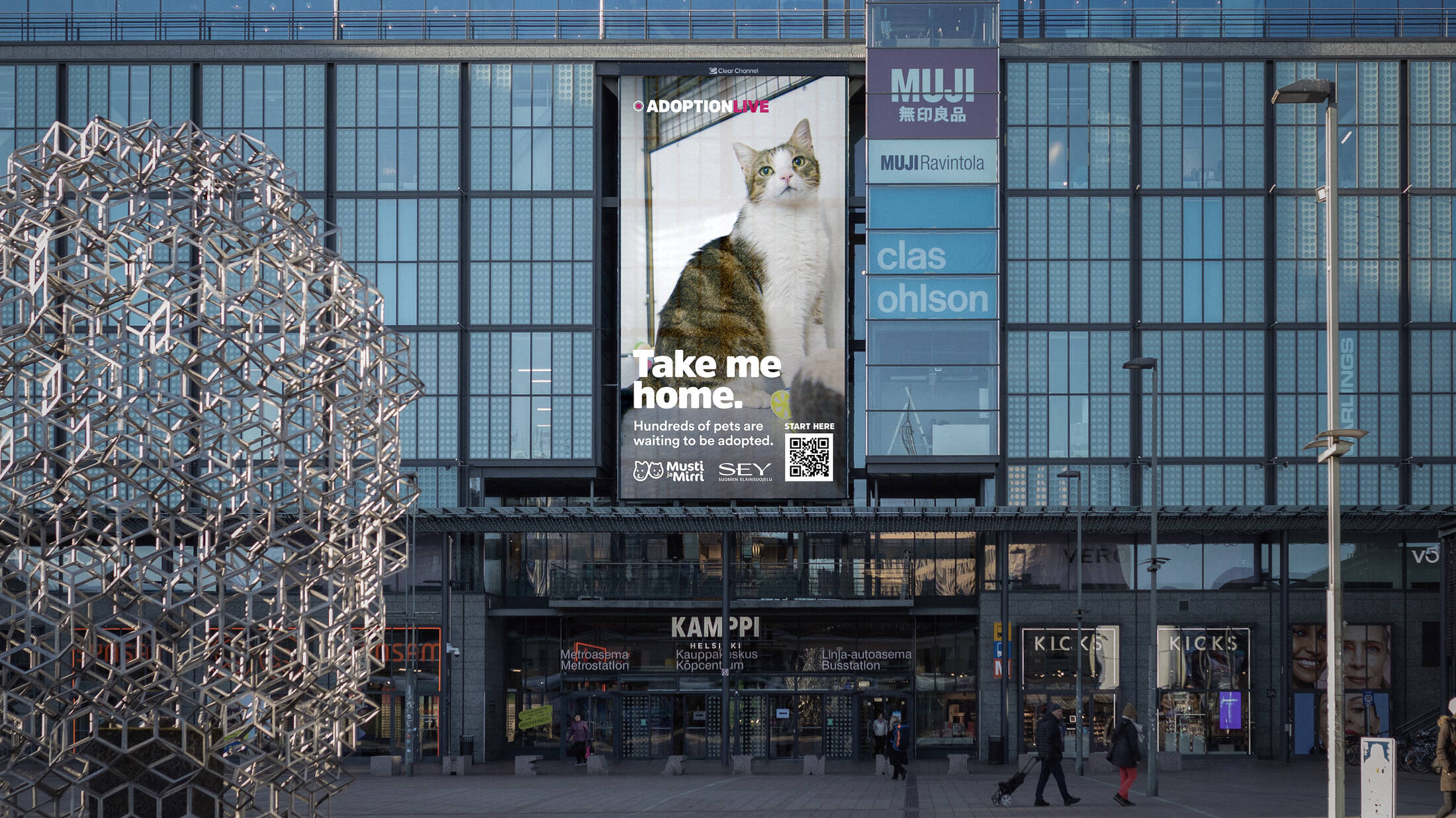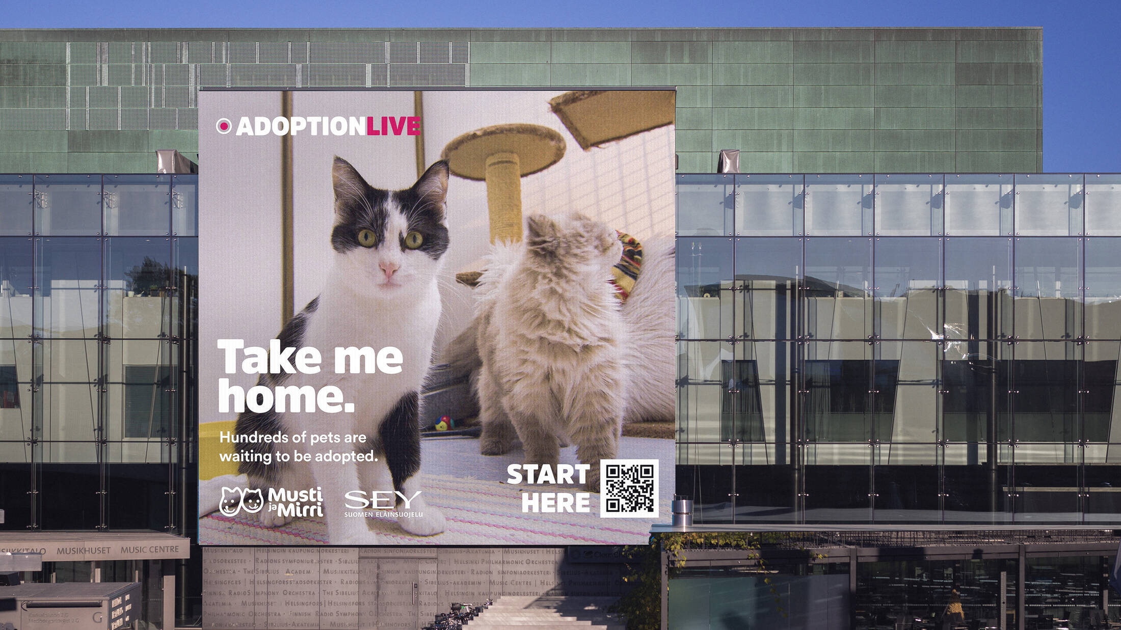 A nationwide cat crisis is unfolding in Finland where over 20,000 cats are abandoned each year and animal shelter resources are stretching thin. Now Nordics’ largest pet store chain Musti Group is launching Adoption Live, the world's first fully live-streamed outdoor campaign to help solve the problem. The nationwide campaign allows people to kick off their pet adoption process via billboards that broadcast live to animal shelters and aims to connect pets with their new forever homes.