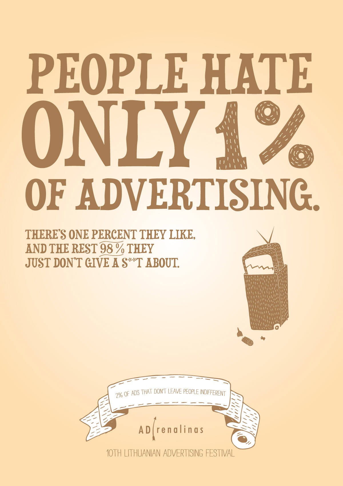 This professional campaign titled 'Advertising Truth, Sh*t, Advertising Truth%, Advertising ...' was published in Lithuania in May, 2012. It was created for the brand: ADrenalinas, by ad agency: Milk. This Print medium campaign is related to the Professional Services industry and contains 3 media assets. It was submitted over 13 years ago.