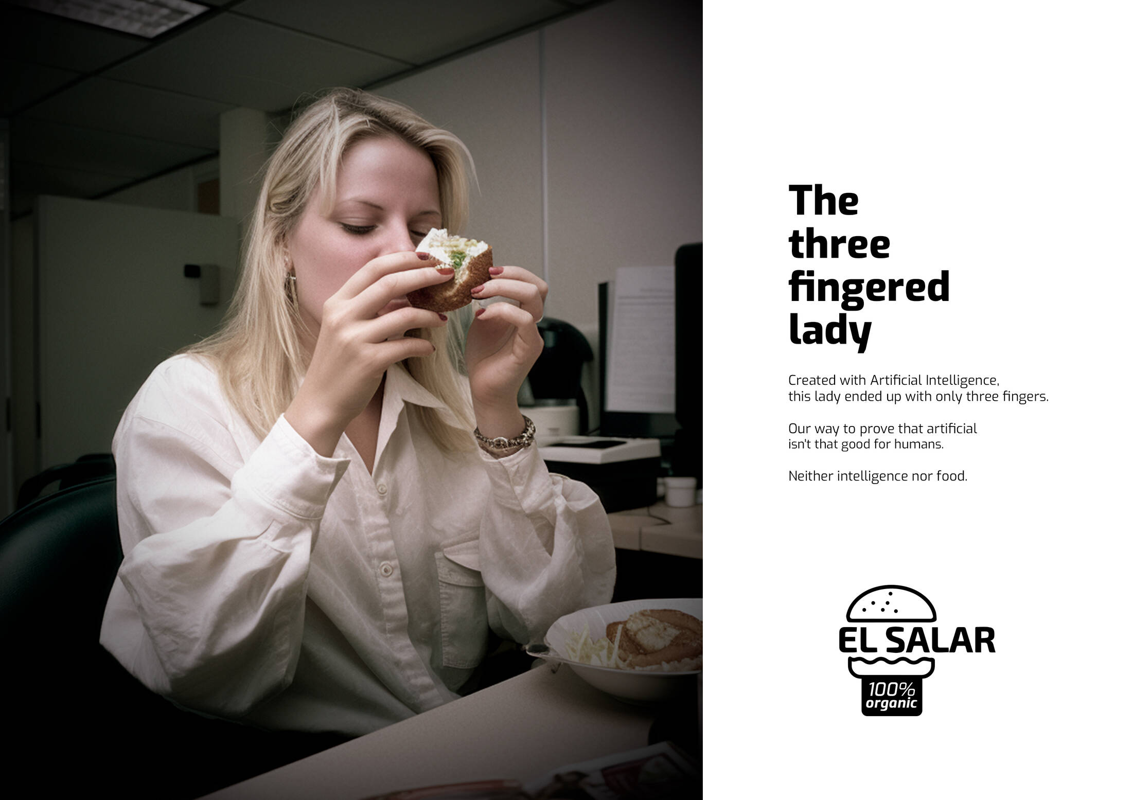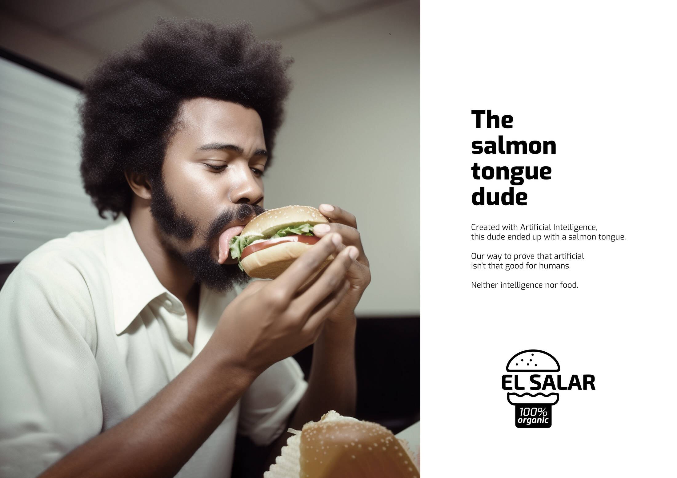 We asked Midjourney to create images of young people eating burgers, and the Artificial Intelligence did its part by making the anticipated errors. Midjourney generated a woman with three fingers, a boy with a third cheese lip, and another with a salmon tongue. The campaign came to life from there. Unlike other campaigns, we didn't have headlines for each artwork or sketches since we relied on the errors made by Artificial Intelligence. That was the key and the differentiator of this disruptive campaign. We were a little afraid that it wouldn't happen, but it did. The errors of the artificial were there, waiting to be transformed into advertising brushstrokes, delivering the concept: artificial is not that good for humans.