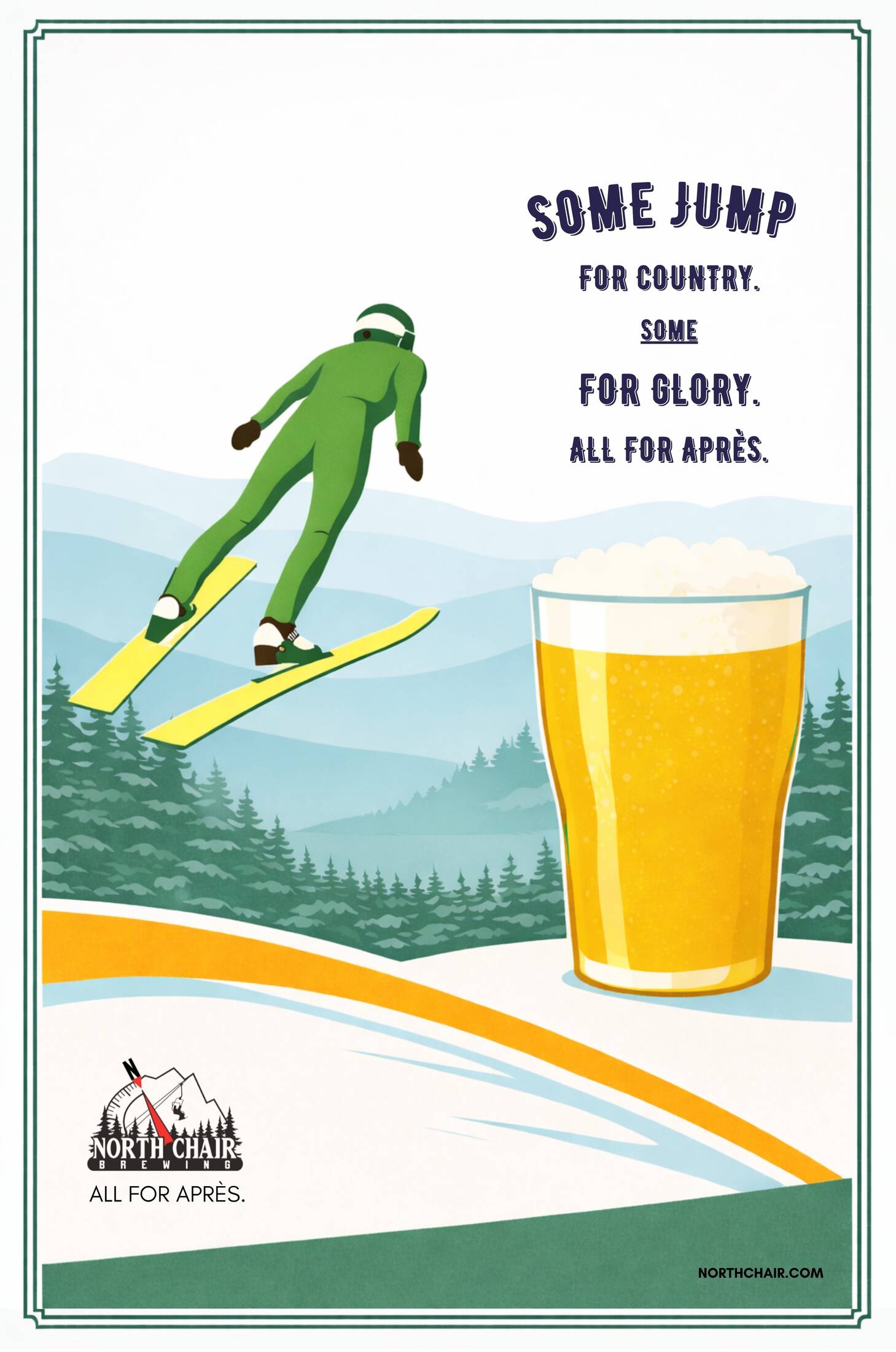 These on-site event sponsorship posters were crafted with a vintage flair to celebrate the athletes and spectators at the 100-year anniversary of the Harris Hill Ski Jump in Brattleboro, Vermont. This event is a major stop on the United States American Ski Jumping tour, and the perfect opportunity to support our local athletes and fans. Because chasing dreams is much more rewarding when it’s “All For Après.”