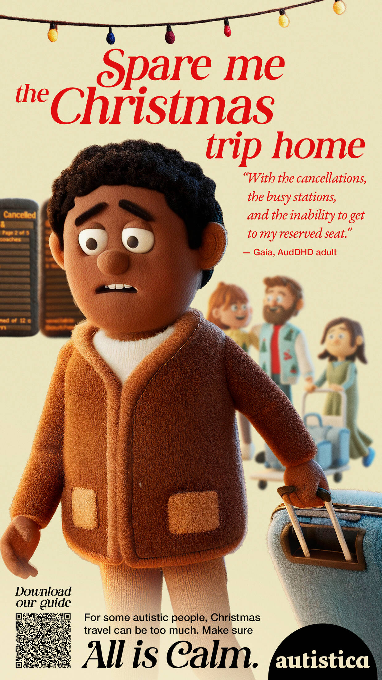 This professional campaign titled 'All is Calm' was published in United Kingdom in December, 2025. It was created for the brand: Autistica, by ad agency: Dojo. This Integrated and OOH Outdoor media campaign is related to the Health and Public Interest industries and contains 5 media assets. It was submitted 25 minutes ago.