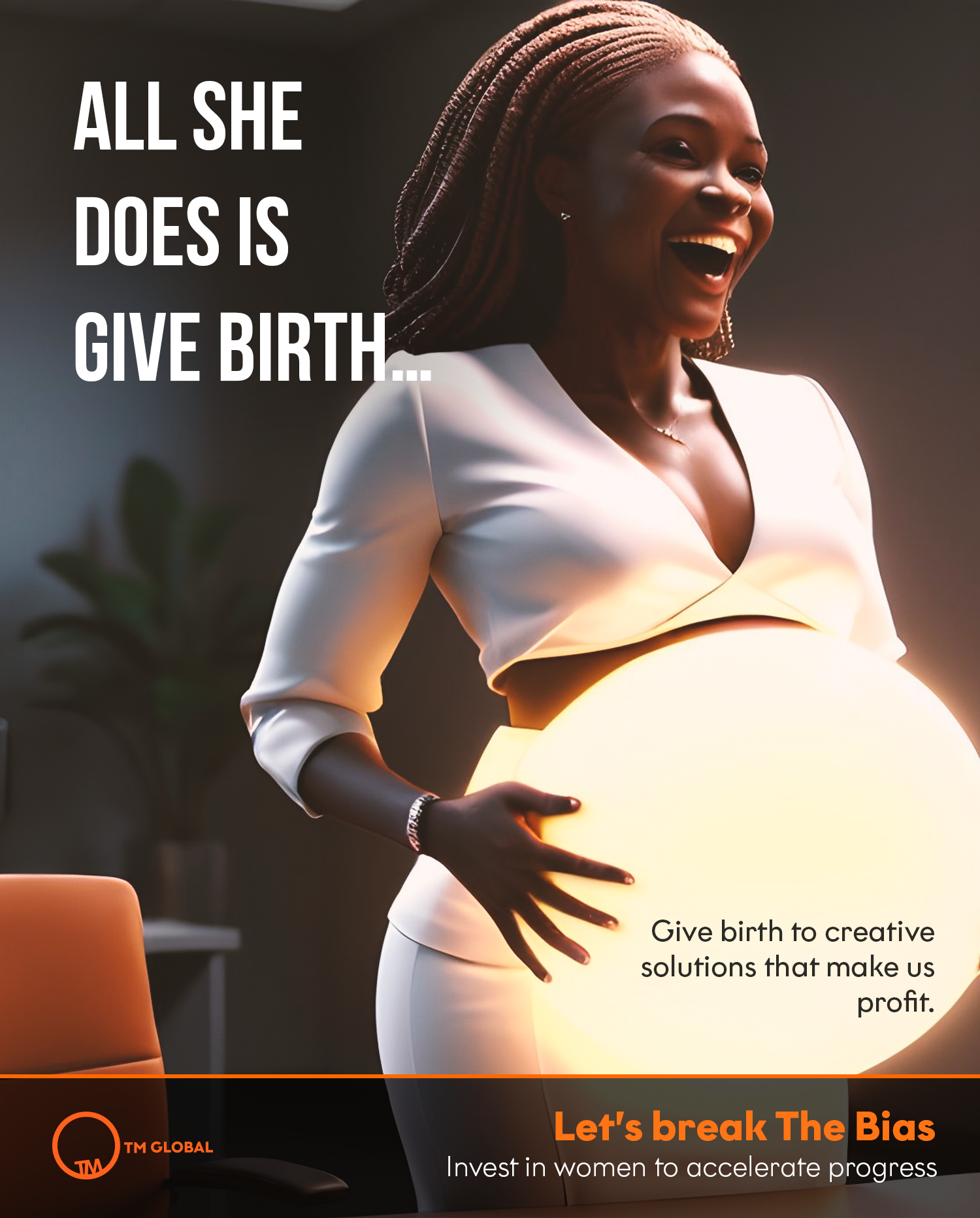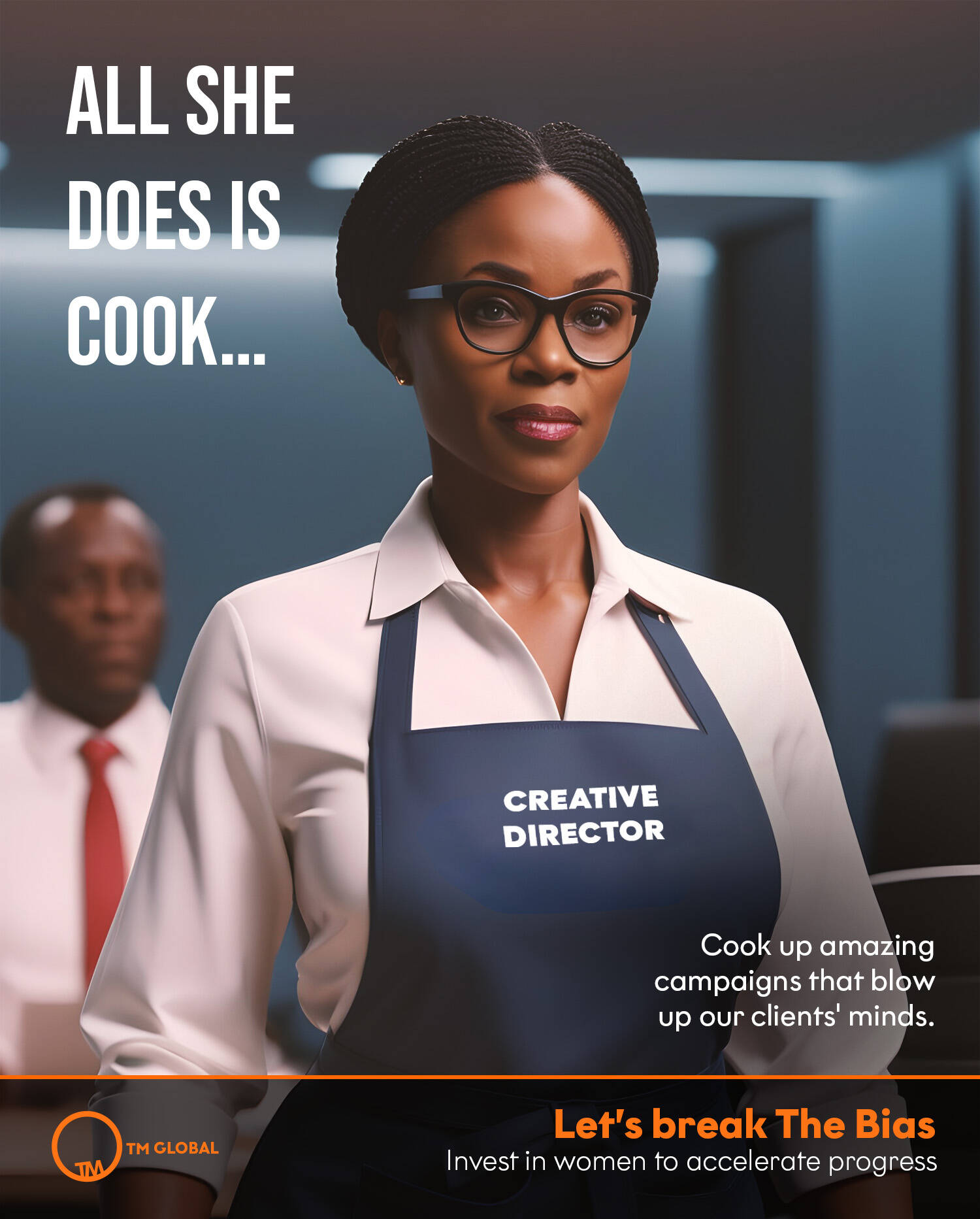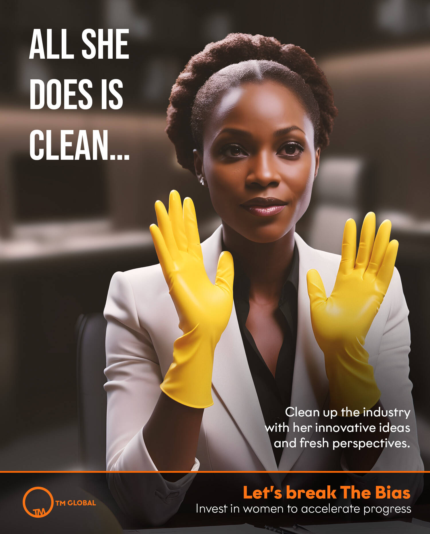 Visuals add another layer of defiance, depicting women dominating corporate boardrooms while holding cooking utensils or donning household gloves and aprons. Their fierce poses and authoritative stances radiate capability.