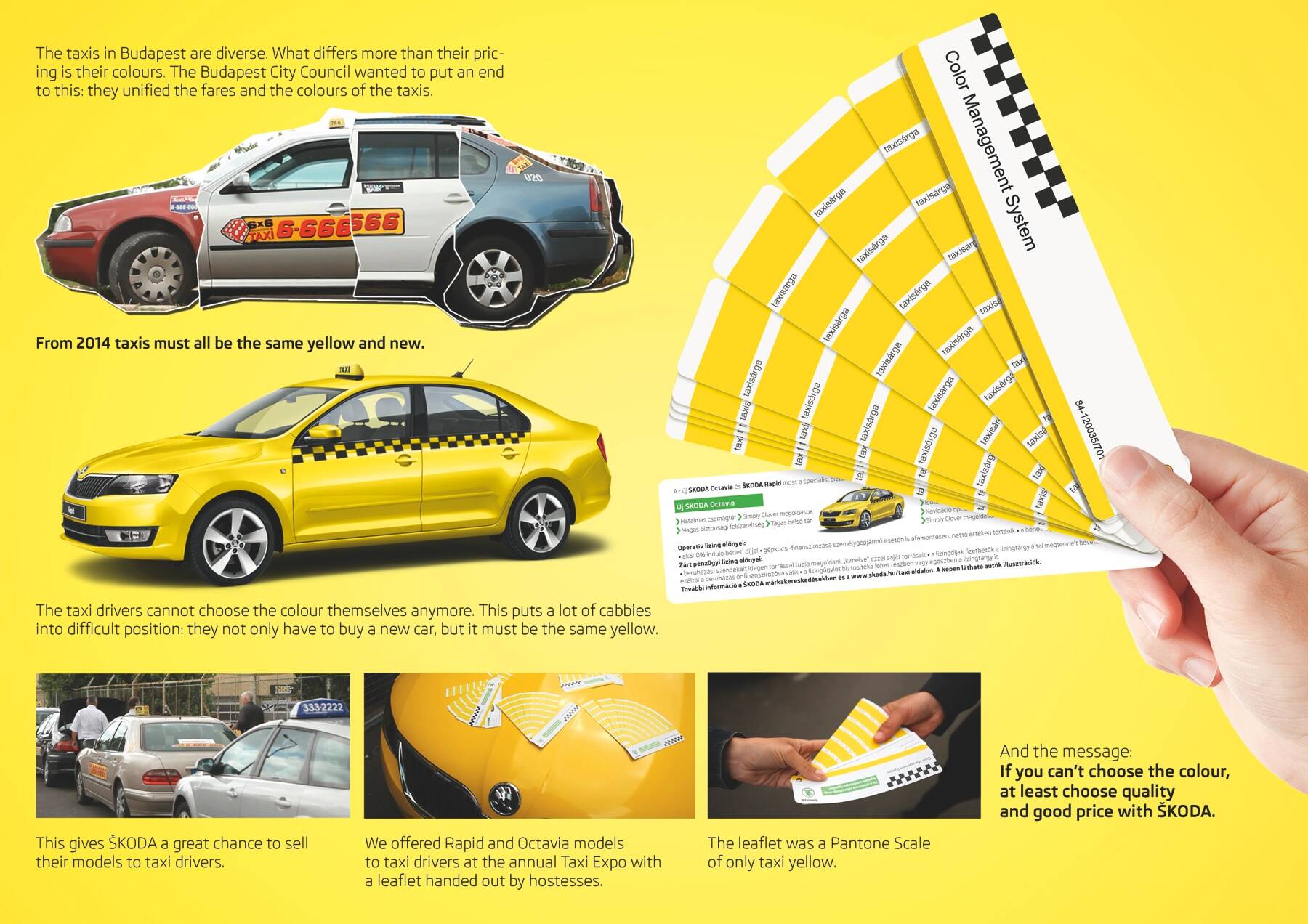 From 2014 all taxis in Budapest must have the same yellow colour. Cabbies need to spend a fortune to either buy a new and yellow car, or paint their old one yellow. With the all-yellow colour palette flyer ŠKODA showed them that they indeed have a choice: though they can't choose the colour of their taxis, they can at least choose good value for their money. The all-yellow palettes were handed out like leaflets at the Hungarian Taxi Expo to cabbies.