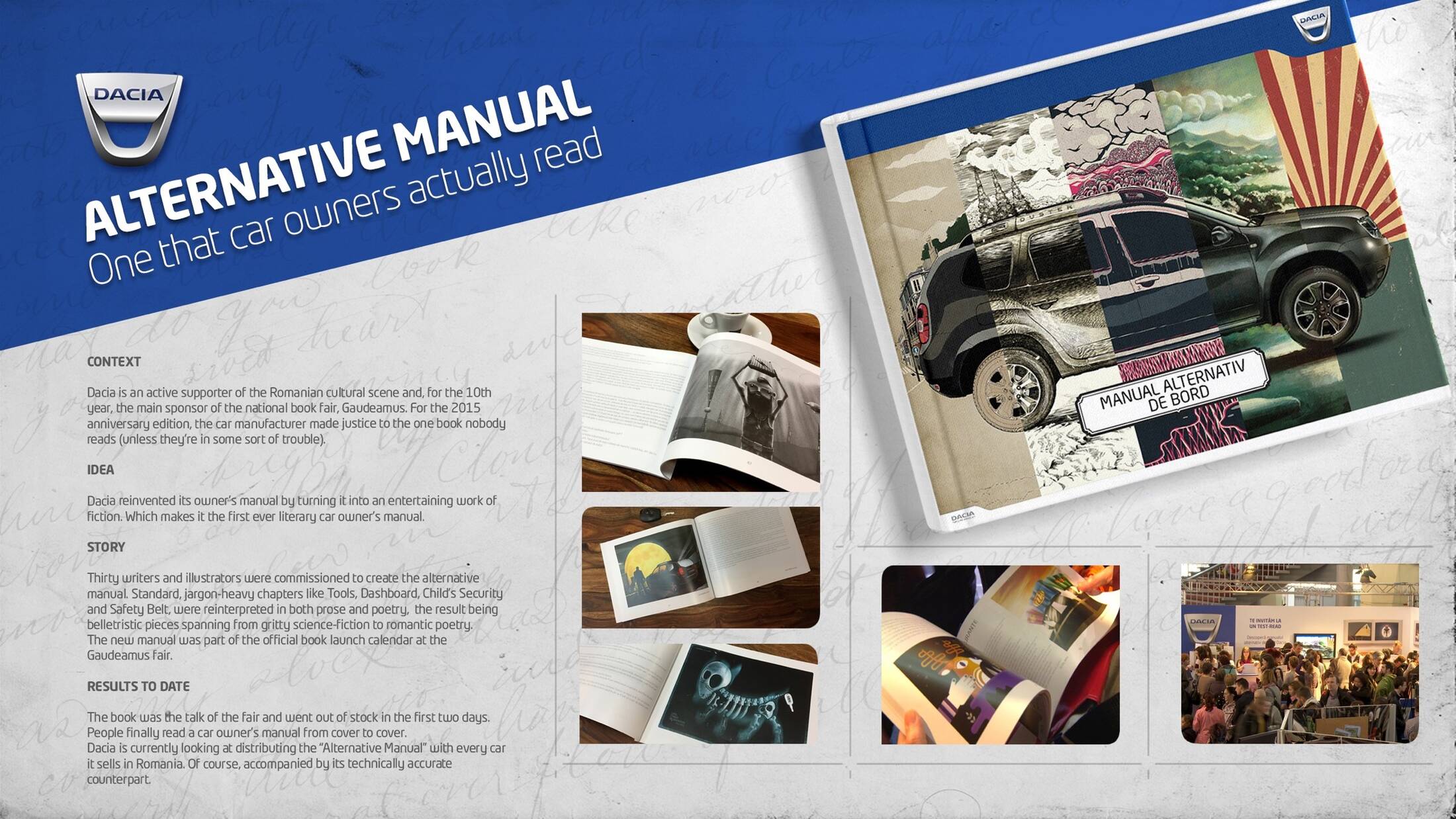 This professional campaign titled 'Alternative manual' was published in Romania in January, 2016. It was created for the brand: Dacia, by ad agency: Publicis. This Static Images medium campaign is related to the Automotive and Personal Transportation industry and contains 1 media asset. It was submitted almost 10 years ago.