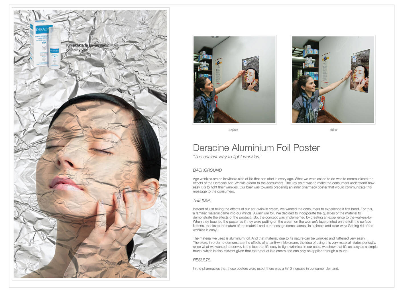 This professional campaign titled 'Aluminium foil poster' was published in Turkey in April, 2010. It was created for the brand: Deracine, by ad agency: McCann. This Ambient medium campaign is related to the Health industry and contains 1 media asset. It was submitted over 15 years ago.