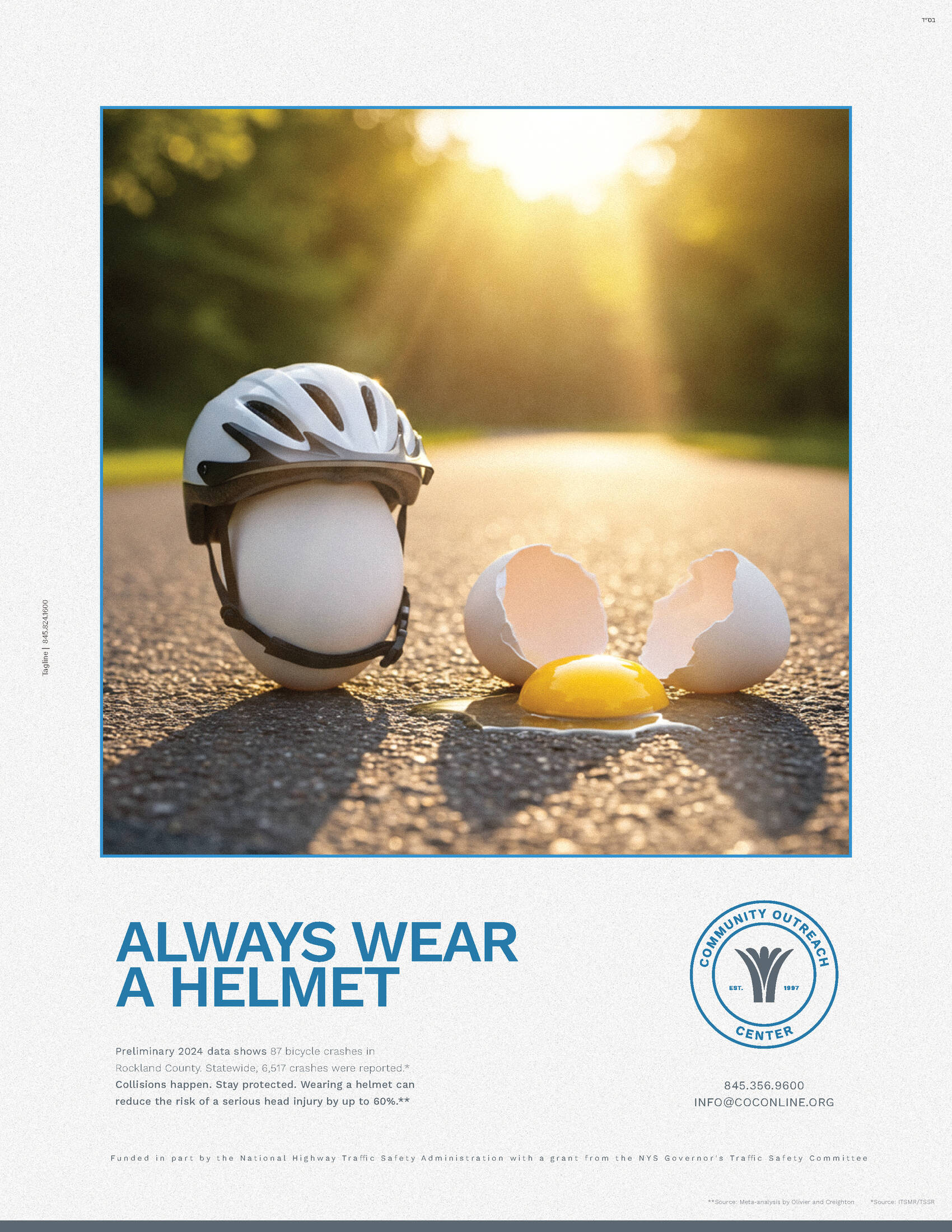 This public safety ad uses humor and visual metaphor to promote bicycle helmet use. Created for the Community Outreach Center, it highlights the importance of protecting your head, with a cracked egg representing head trauma.