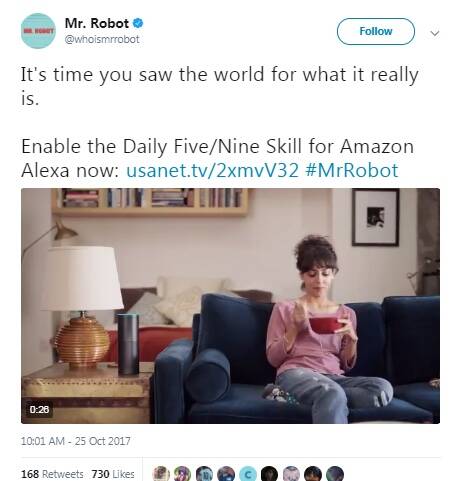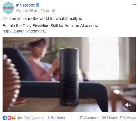 Amazon partnered with USA Network and the Mr. Robot show team to create robust brand presence and product usage within the show’s third season. An in-world Amazon Alexa game fuelled fans’ fascination with the show’s mind-bending storylines, and brought them closer to the Mr. Robot narrative and world they love. The game experience supported Amazon’s organic in-show integration in Mr. Robot, and was promoted via custom in-world creative content across all platforms, driving season-long brand association and fan engagement.