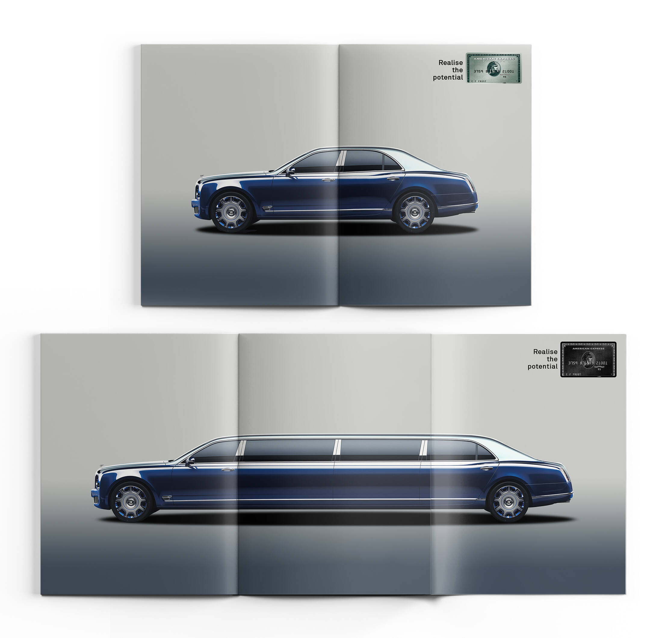 This gatefold spread demonstrates the buying power of an Amex Black Card.