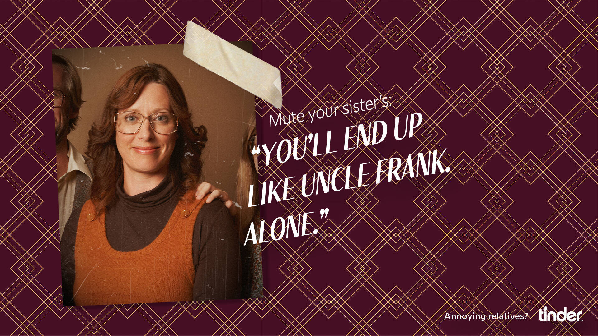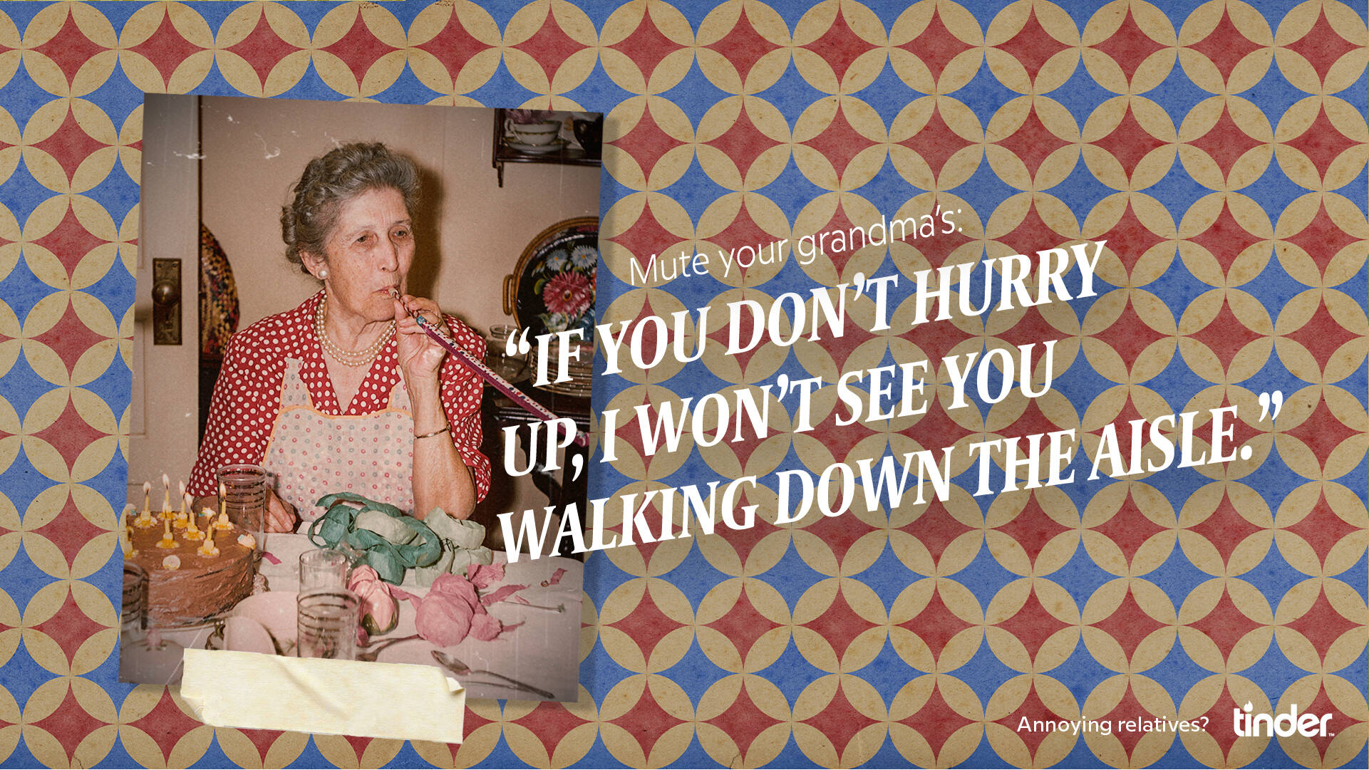 This student campaign titled 'Annoying Relatives' was published in Spain in June, 2021. It was created for the brand: Tinder, by ad school: Miami Ad School. This Print medium campaign is related to the Professional Services industry and contains 5 media assets. It was submitted over 4 years ago by Copywriter: Martim.
