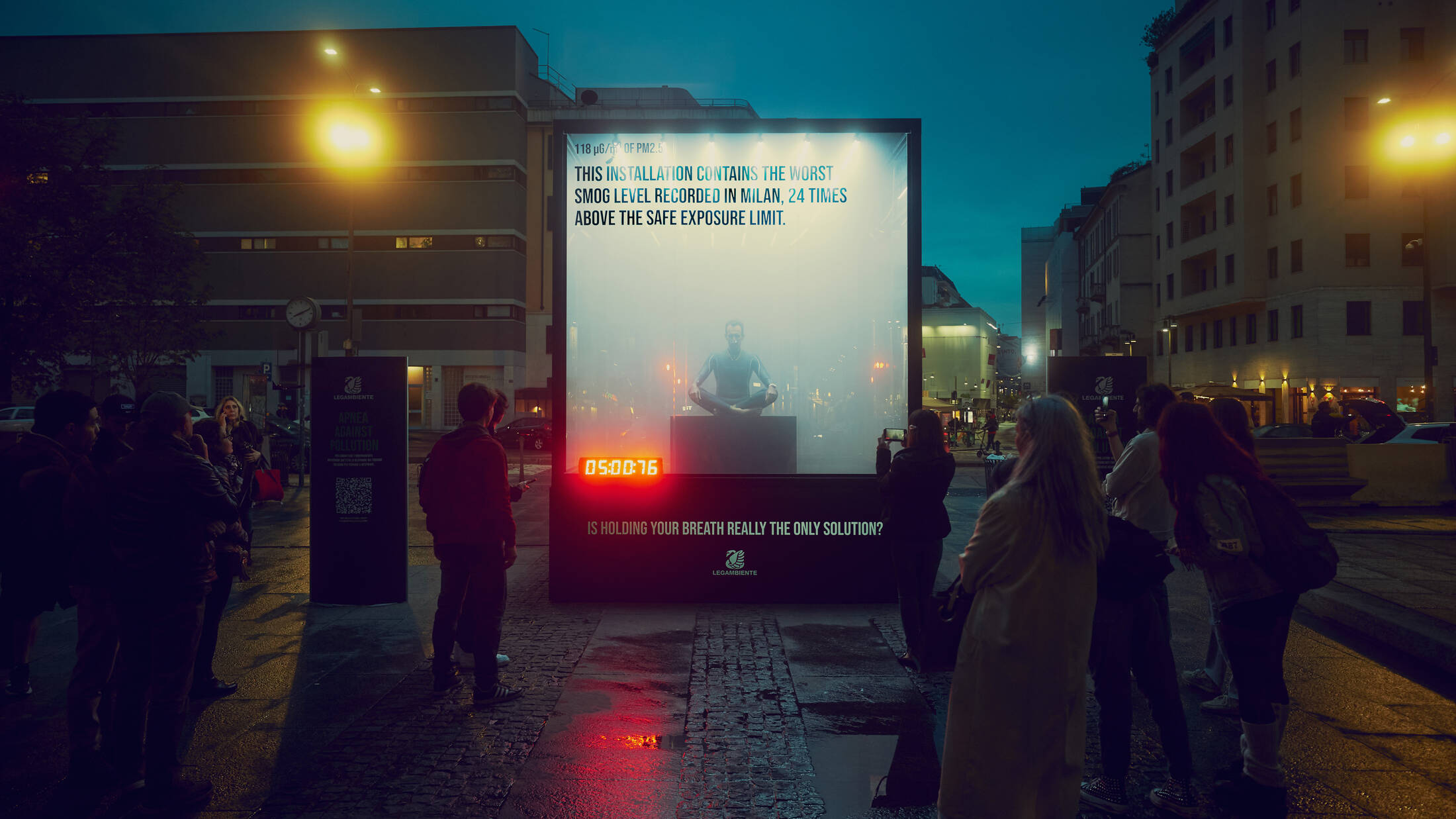 Legambiente, the leading environmental association in Italy that has been working since 1980 to improve the country's environment, combat pollution, and tackle environmental crime, launches Apnea Against Pollution to once again raise awareness among the public about air pollution in Italy. It does so starting from Milan with a striking performance, conceived in collaboration with the agencies of the Publicis Group Leo Burnett and MSL, and realized in Piazza XXV Aprile, together with the former world freediving record holder, now a medical doctor and sports coach, Mike Maric, who immersed himself inside a transparent cube containing the highest level of smog recorded last February in Milan (118 µg/mc3 of PM2.5), twenty-four times above the limit recommended by the World Health Organization (WHO) . The aim is to send a precise and clear message: "To fight pollution, we must not stop breathing but find solutions to breathe again."