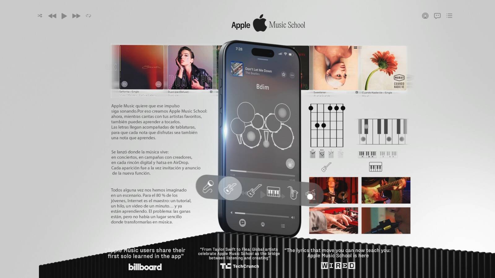 This student campaign titled 'Apple Music School ' was published in Colombia in January, 2026. It was created for the brands: Apple and Apple Music, by ad school: Bendita Carpeta. This 360°, Content, and Digital media campaign is related to the Education, Electronics, Technology, and Music industries and contains 4 media assets. It was submitted about 2 hours ago.