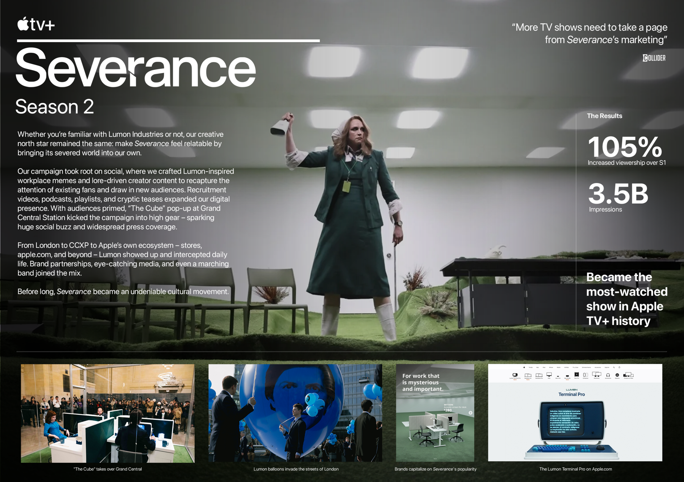This professional campaign titled 'Apple’s Severance S2 Integrated Campaign' was published in United States in January, 2025. It was created for the brand: Apple TV+, by ad agency: Jellyfish Global. This Content, Film, and Integrated media campaign is related to the TV and Streaming Promos industry and contains 2 media assets. It was submitted 27 days ago.