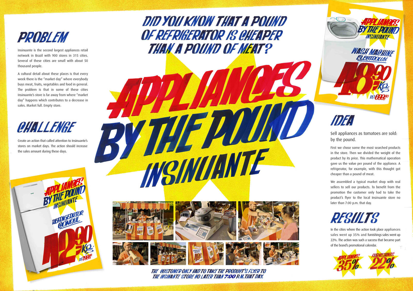 This professional campaign titled 'Appliances by the pound' was published in Brazil in April, 2012. It was created for the brand: Insinuante, by ad agency: Propeg. This OOH Outdoor medium campaign is related to the Retail Services industry and contains 1 media asset. It was submitted over 13 years ago.