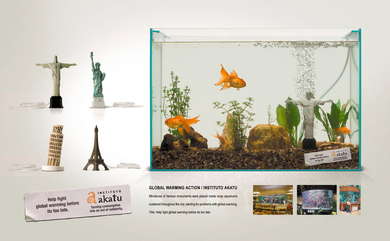 Global warming action by Instituto Akatu. Miniatures of famous monuments were placed inside large aquariums scattered throughout the city, alerting for problems with global warming.