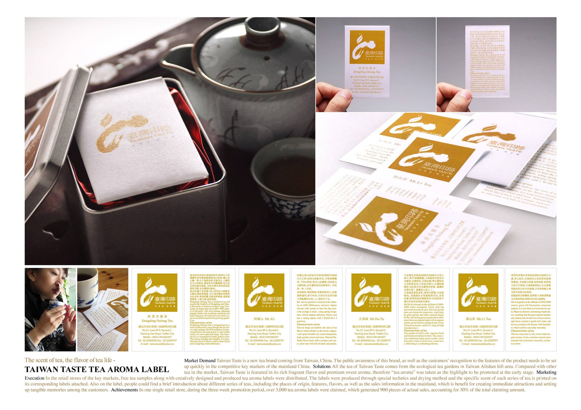This professional campaign titled 'Aroma labels' was published in China in November, 2013. It was created for the brand: Taiwan Taste Tea, by ad agency: Brand 8. This Static Images medium campaign is related to the Drinks (Non Alcoholic) industry and contains 1 media asset. It was submitted about 11 years ago.