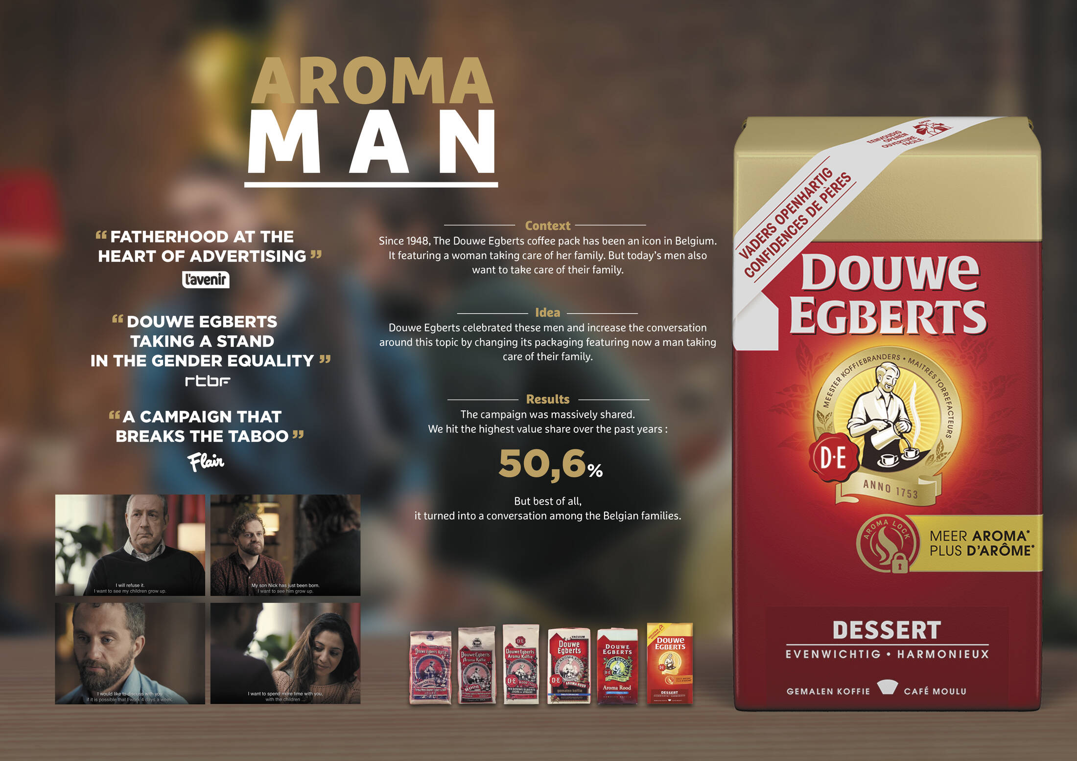 Since 1948, The Douwe Egberts coffee pack has been an icon in Belgium. It featuring a woman taking care of her family. But unlike in 40’s, today’s men also want to take care of their family. Even if they still feel pressured to live up to gender norms. So, Douwe Egberts decided to celebrate their courage by changing its packaging. The woman on the pack became a man. Symbolizing all men who take care of their loved ones. To increase the conversation around this topic, we created 4 inspiring stories of fathers opening their hearts. The campaign was massively shared and we hit the highest value share over the past years : 50,6%. But best of all, it turned into a conversation among Belgian families.