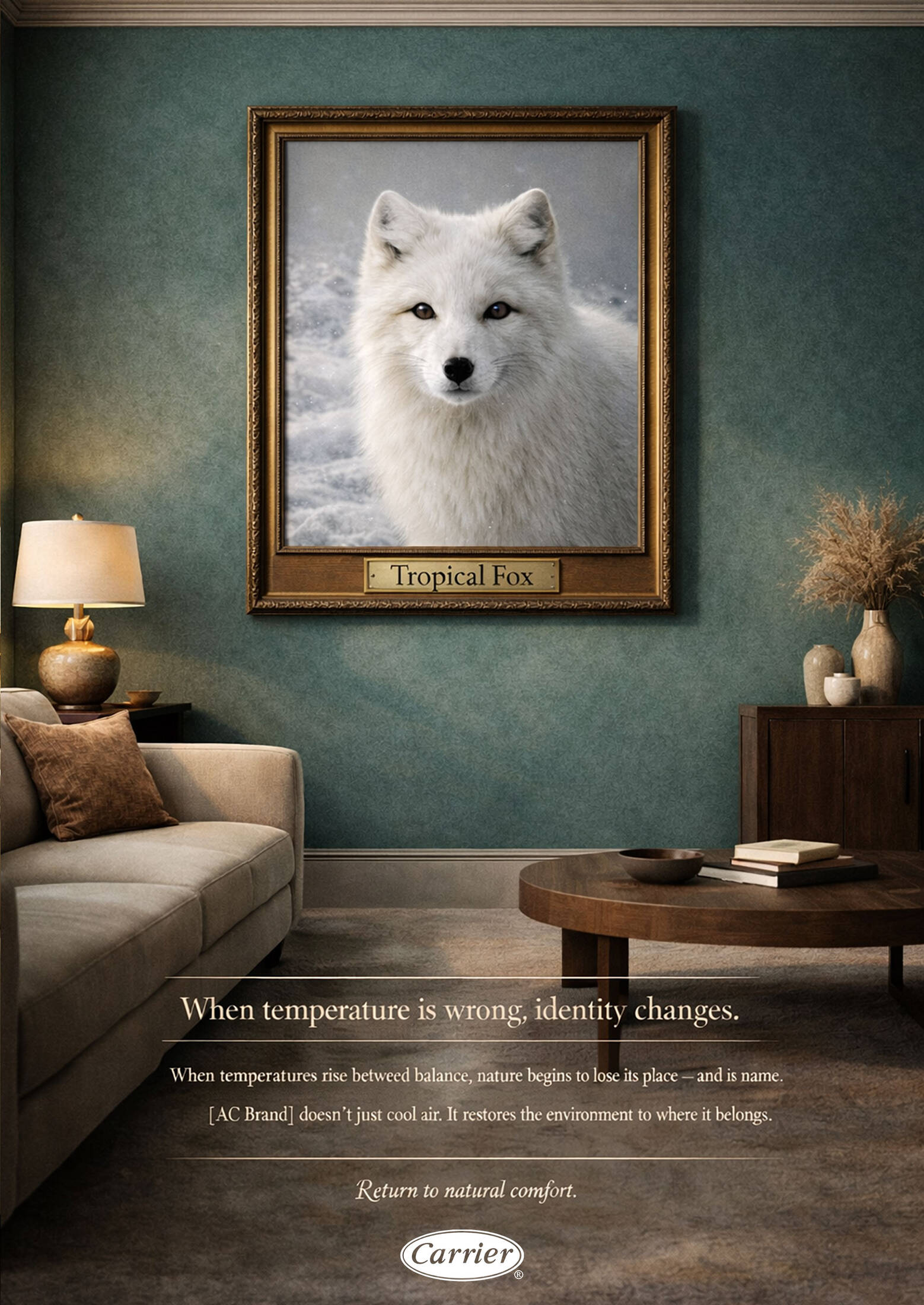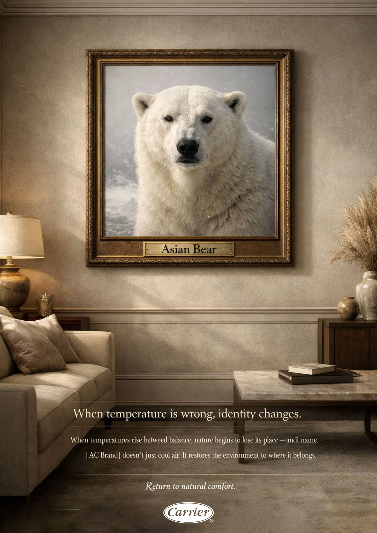 This student campaign titled 'Asian-Bear' was published in India in December, 2025. It was created for the brand: Carrier, . This Print medium campaign is related to the Electronic Devices and Industrial industries and contains 2 media assets. It was submitted about 8 hours ago by Creative Consultant (Idea, Art, Writings): Sushil Kumar Swamy.