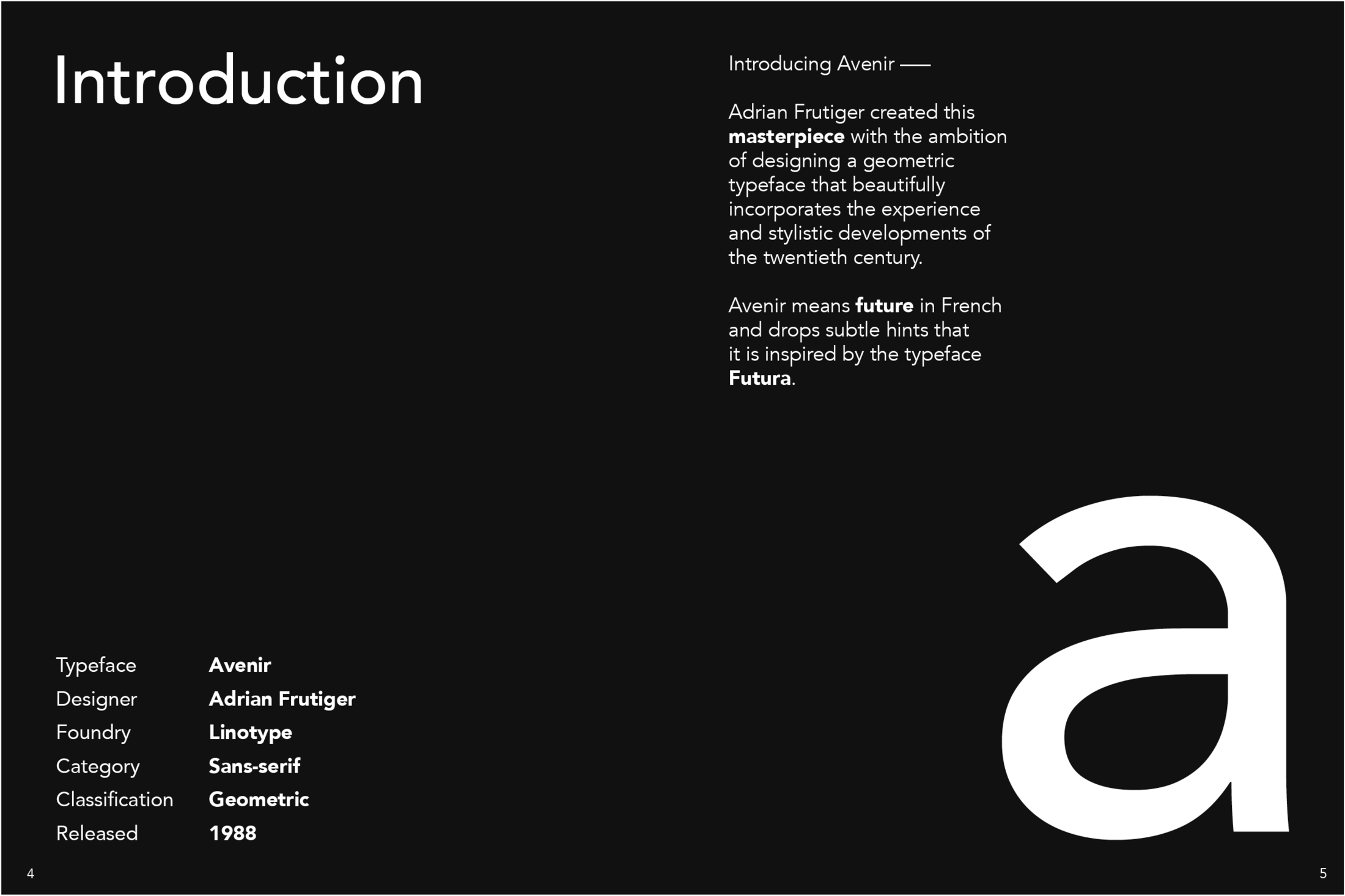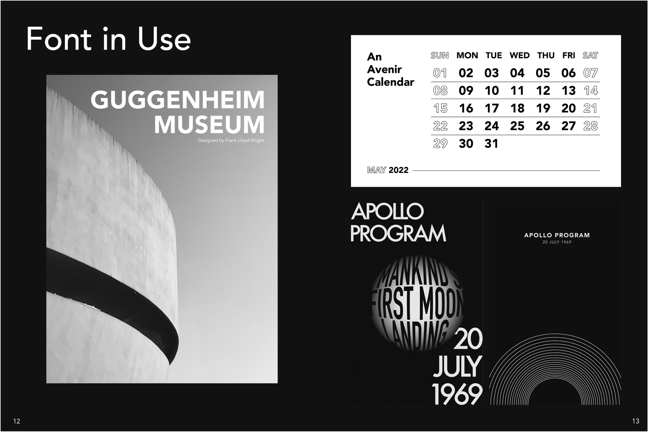 This student campaign titled 'Avenir Type Specimen' was published in United States in January, 2023. It was created by ad school: Miami Ad School. This Design, Digital, and Print media campaign is related to the Other industry and contains 9 media assets. It was submitted almost 3 years ago by Art Director: Tan Wan.