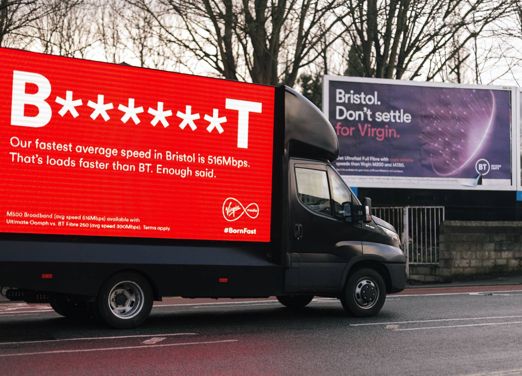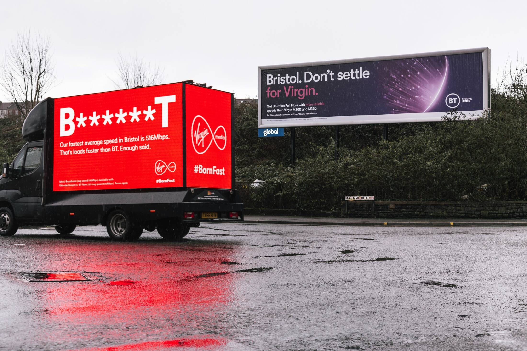 Virgin Media has today called out BT’s dubious, unsubstantiated advertising with a cheeky and provocative stunt that highlights the strength of Virgin Media’s network and its continued speed superiority over the UK’s telecoms incumbent. BT’s billboards, which are currently deployed in Bristol, claim that residents in the area shouldn’t “settle for Virgin” and instead opt for services provided by the century-old company which started life as a telegraph operator. Virgin Media’s billboard helps to separate B*** ***T from reality given its ultrafast network passes more premises with faster speeds in the city and surrounding areas.