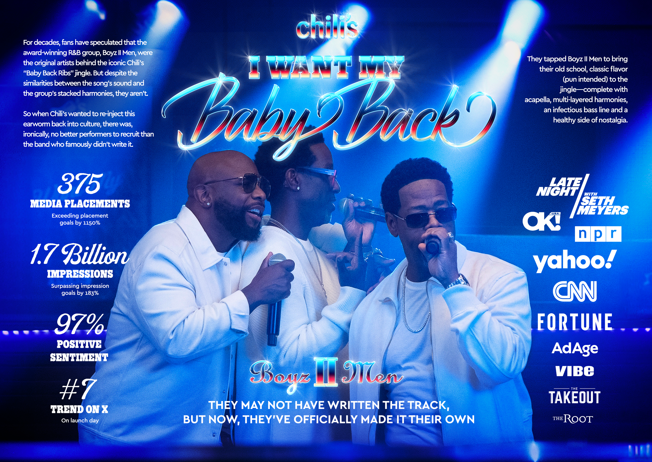 This professional campaign titled 'Baby Back Boyz II Men' was published in United States in February, 2025. It was created for the brand: Chili's, by ad agency: Mischief @ No Fixed Address. This Integrated medium campaign is related to the Food industry and contains 2 media assets. It was submitted 9 months ago.
