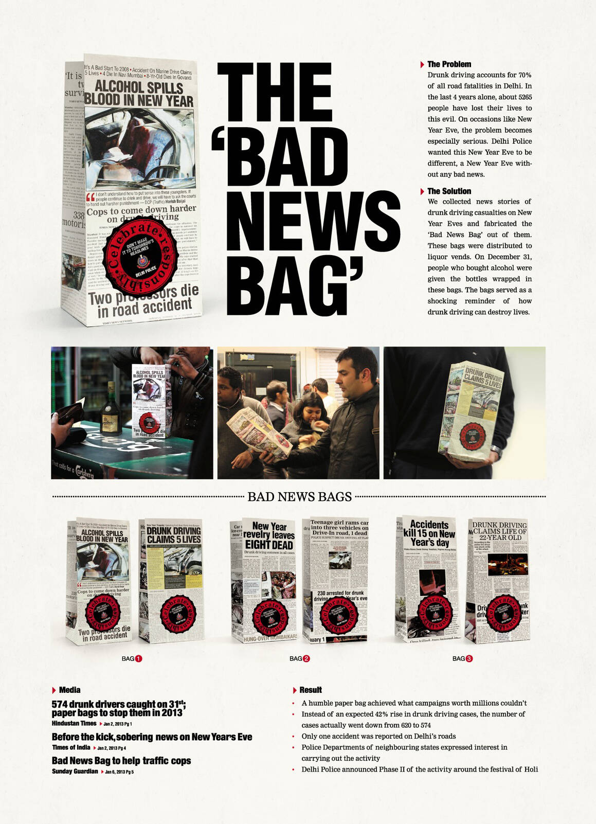 This professional campaign titled 'Bad news bag' was published in India in December, 2012. It was created for the brand: Delhi Police, by ad agency: Eleven. This Static Images medium campaign is related to the Public Interest industry and contains 1 media asset. It was submitted over 12 years ago.