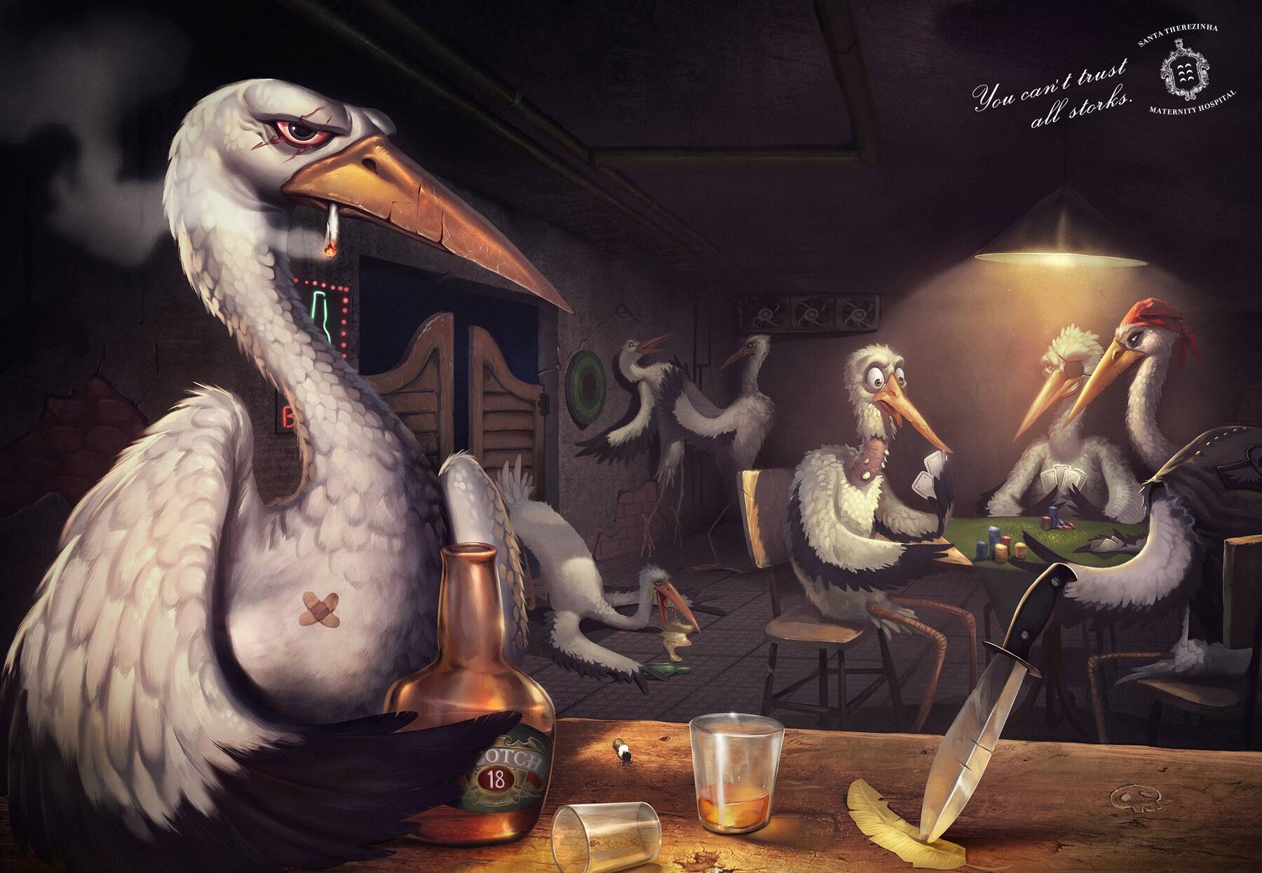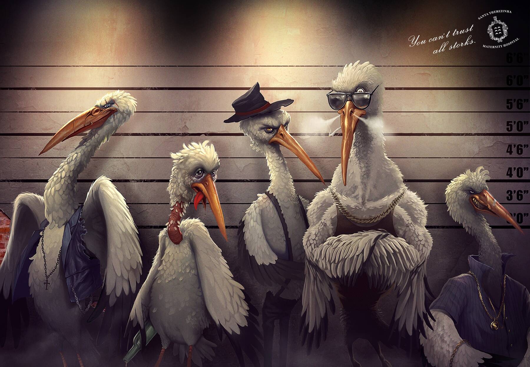 This professional campaign titled 'Bad storks, Bar, Bad storks, Lineup' was published in Brazil in May, 2013. It was created for the brand: Santa Therezinha Maternity Hospital, by ad agency: Binder. This Print medium campaign is related to the Health industry and contains 2 media assets. It was submitted over 12 years ago.