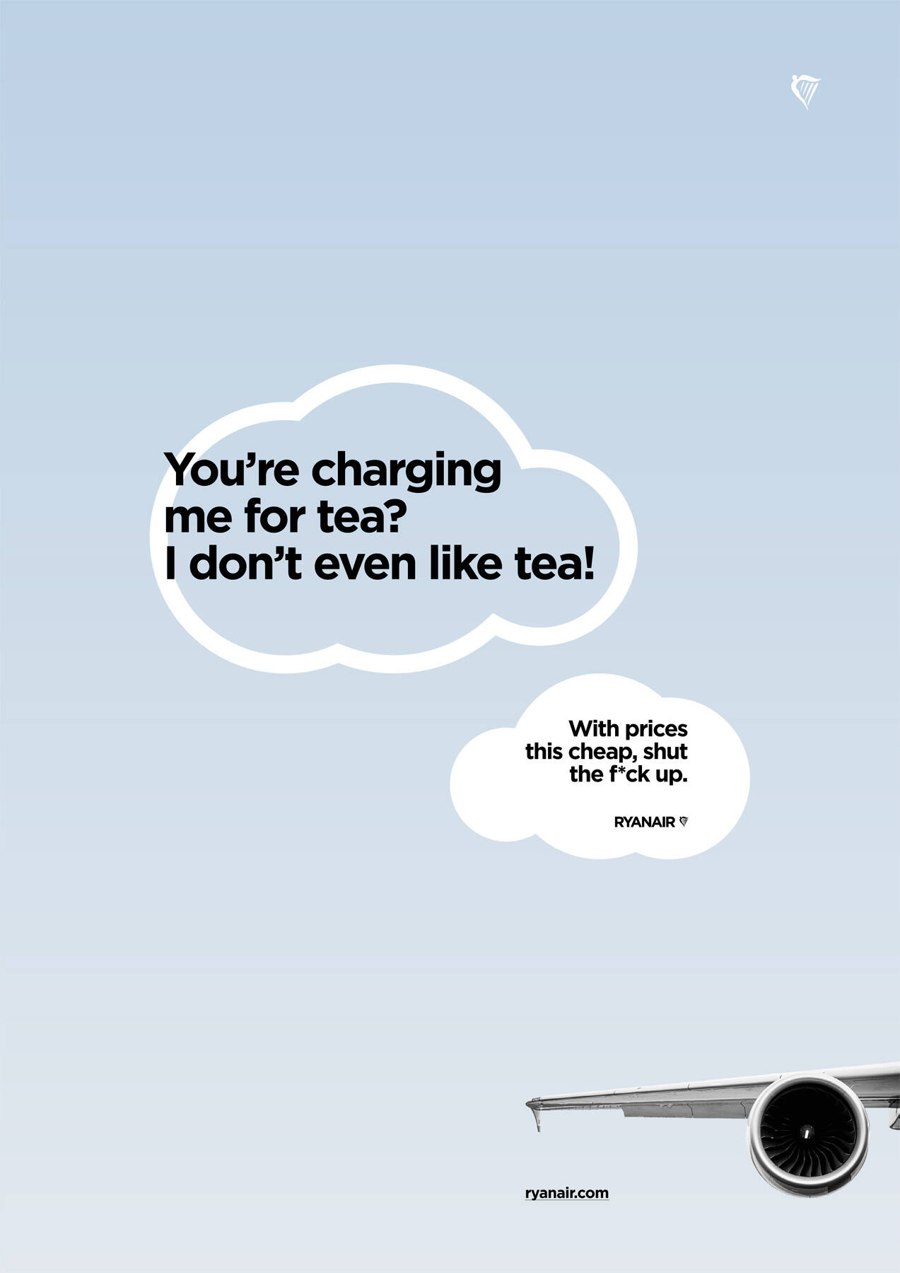 This professional campaign titled 'Bag, Tea, Sandwich' was published in United States in February, 2013. It was created for the brand: Ryanair, by ad agency: Miami Ad School. This Print medium campaign is related to the Transport industry and contains 3 media assets. It was submitted almost 13 years ago.