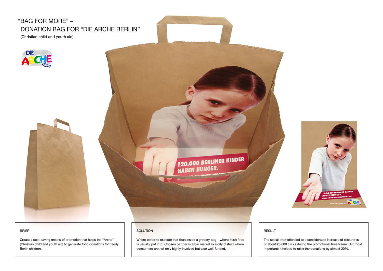 This professional campaign titled 'Bag' was published in Germany in November, 2007. It was created for the brand: Die Arche, by ad agency: Atletico. This Ambient medium campaign is related to the Public Interest industry and contains 1 media asset. It was submitted over 17 years ago.
