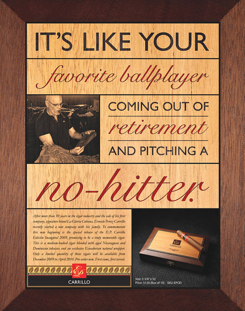 This professional campaign titled 'Ballplayer, Kings' was published in United States in November, 2009. It was created for the brand: E.P. Carrillo, by ad agency: Devito/Verdi. This Print medium campaign is related to the Tobacco industry and contains 2 media assets. It was submitted about 16 years ago.