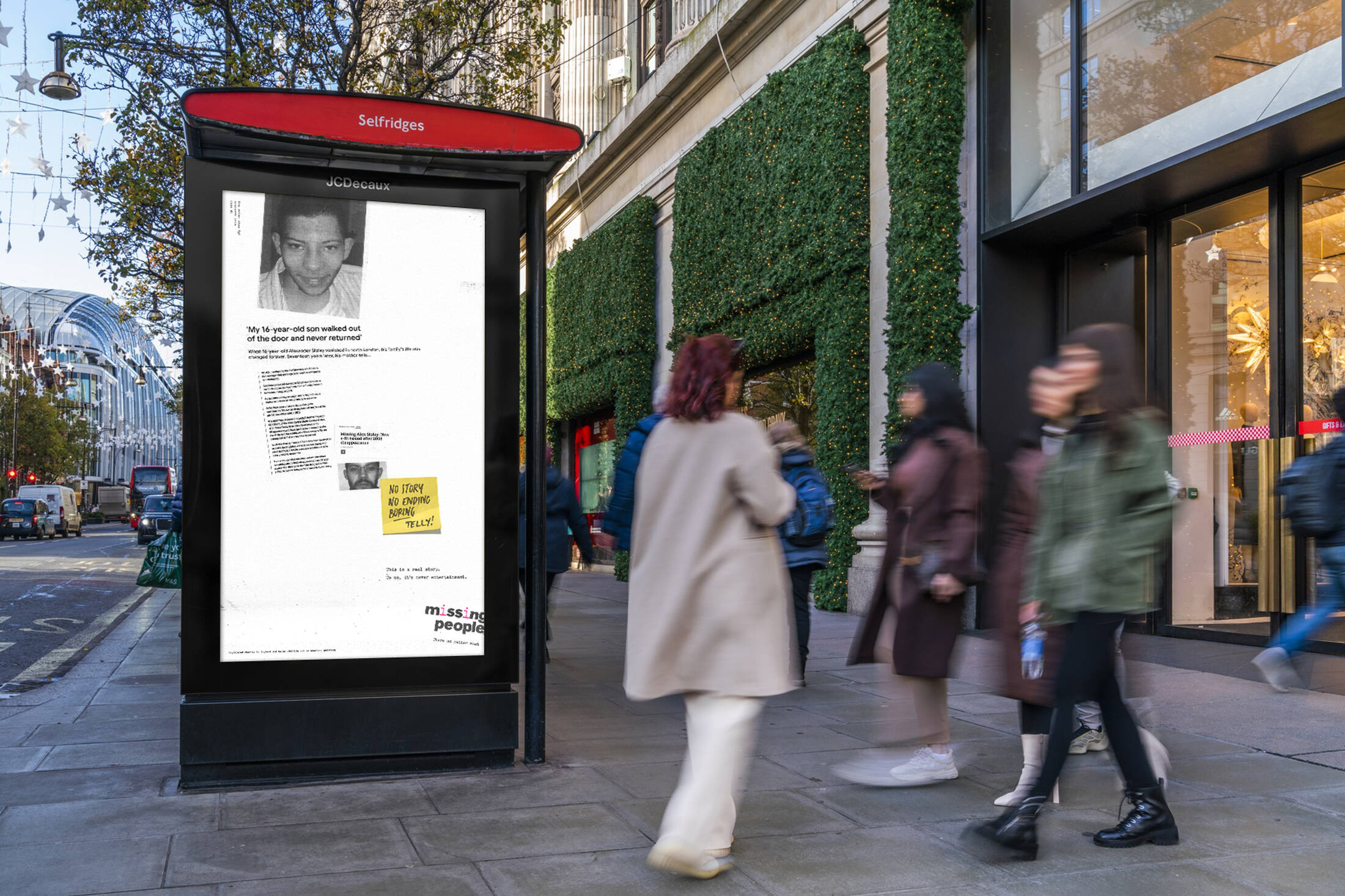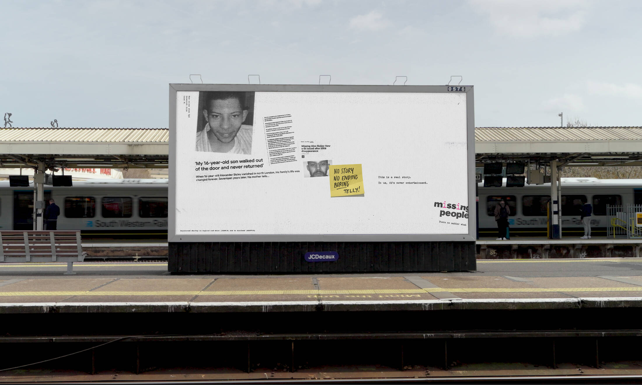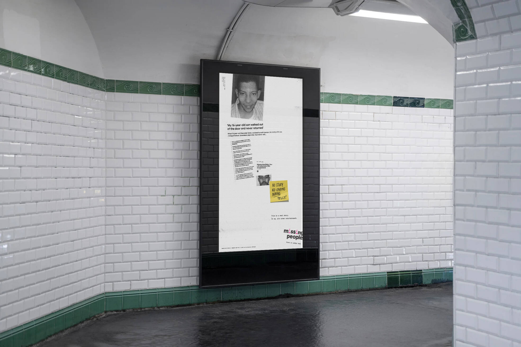 This professional campaign titled ' Based on a true story' was published in United Kingdom in March, 2026. It was created for the brand: Missing People, by ad agency: BBH London. This Film, Integrated, and OOH Outdoor media campaign is related to the Public Interest industry and contains 5 media assets. It was submitted 31 minutes ago.