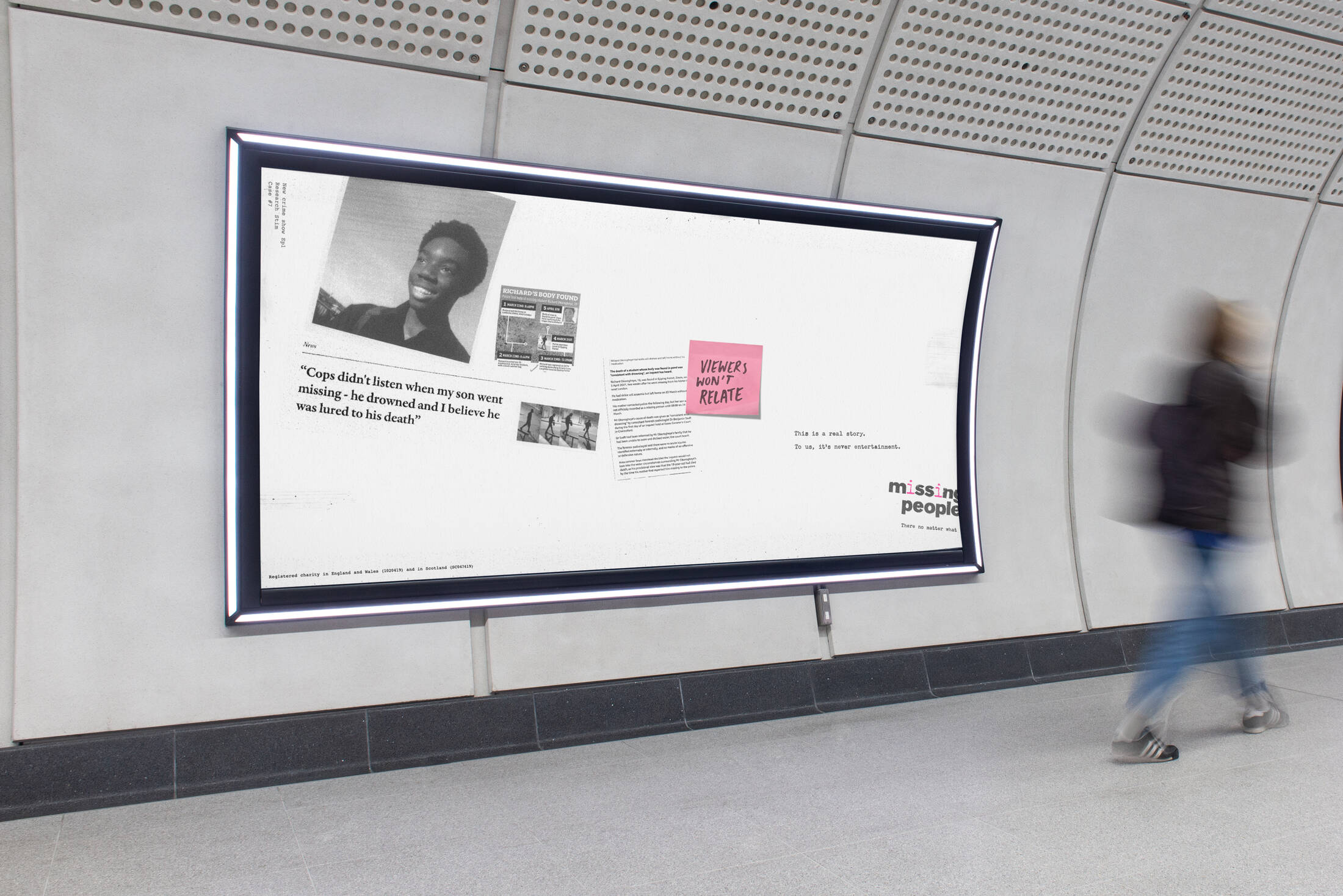 The campaign is supported by a series of hauntingly dark OOH posters designed to look like case files, and judged as entertainment with a series of flippant, detached post-it notes from TV producers.