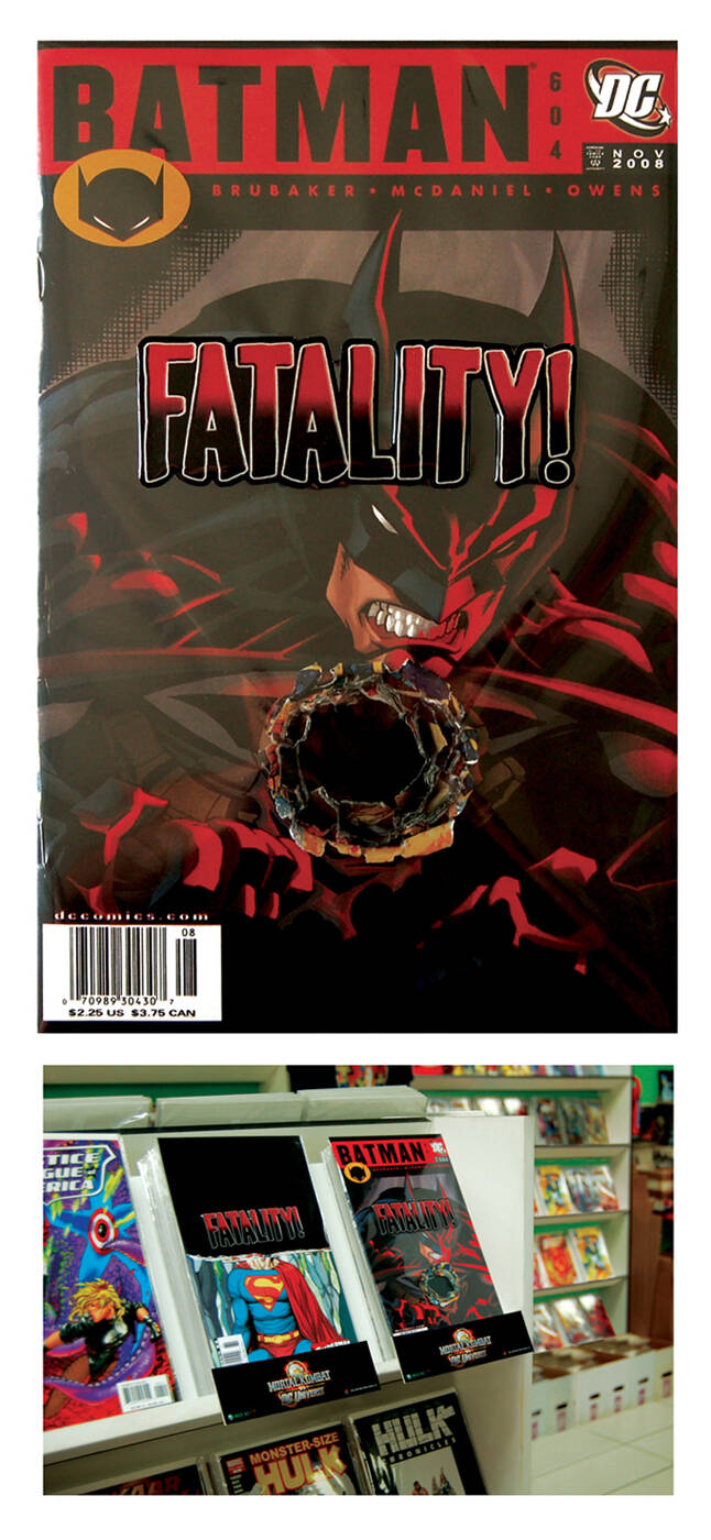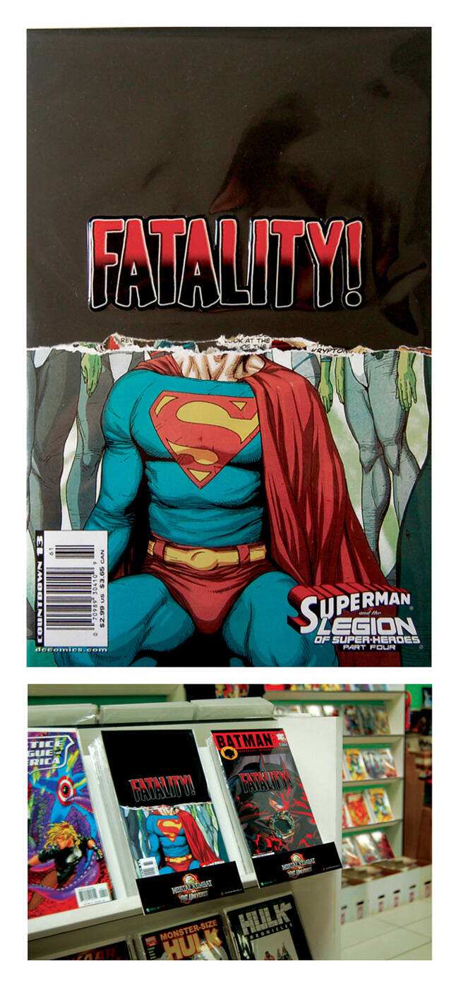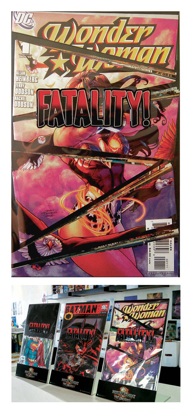 Mortal Kombat vs. DC Universe is a crossover fighting game on the playstation and xbox. The game contains characters from both the Mortal Kombat and the DC Universe (Superman, Batman, Wonder Woman). The Mortal Kombat series is especially noted for its high levels of blood and gore, including, most notably, its traditional graphic fatalities (finishing moves). We placed comics in the comic shops mimicking fatalities on relevant DC comics.